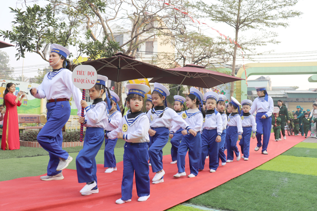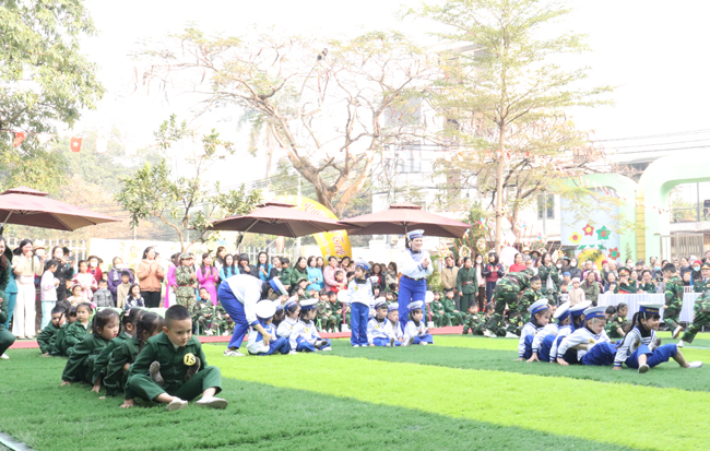 Tham gia Liên hoan, các bé được khoác trên mình quân phục thân thương của các chú bộ đội và thực hành các nội dung: Diễu hành, diễu binh; thi Chiến sĩ khỏe với các nội dung như: nhảy đồng diễn, đua thuyền trên cạn; nhảy bao bố; vận chuyển lương thực về kho; ném lựu đạn trúng đích; thi chiến sĩ tài năng với các tiểu phẩm: Chung tay bảo vệ môi trường; an toàn giao thông là hạnh phúc của mọi nhà. Bên cạnh đó là nội dung giao lưu nhảy sạp giữa cô- trò và đại biểu dự Liên hoan.