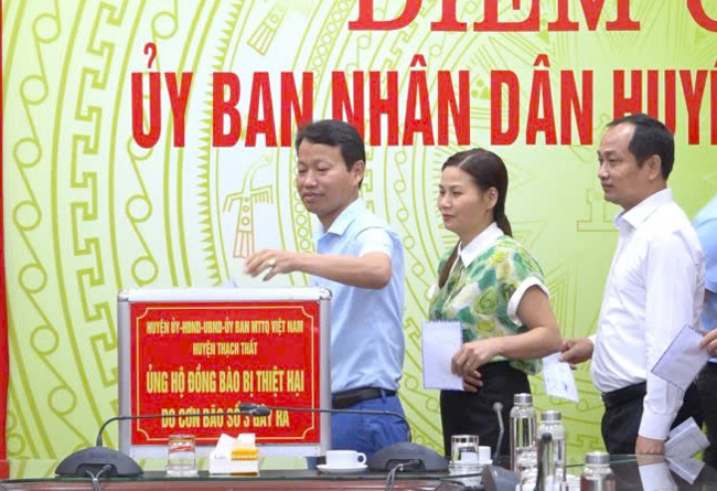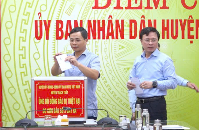 Các đồng chí lãnh đạo huyện ủng hộ người dân bị thiệt hại do bão số 3