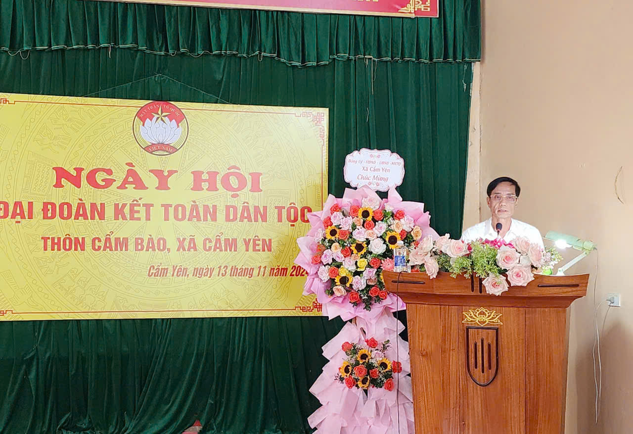 Phát biểu tại Ngày hội đại đoàn kết thôn Cẩm Bào, đồng chí Chủ nhiệm UBKT Huyện ủy ghi nhận, biểu dương những kết quả nhân dân trong thôn đã đạt được. Thời gian tới, cấp ủy, chính quyền, MTTQ và các tổ chức chính trị xã hội thôn Cẩm Bào nói riêng, xã Cẩm Yên nói chung quan tâm tập trung các giải pháp phát triển kinh tế, từng bước nâng cao đời sống nhân dân. Tiếp tục chỉ đạo thực hiện tốt cuộc vận động “Toàn dân đoàn kết xây dựng nông thôn mới, đô thị văn minh”. Quan tâm giải quyết kip thời các vấn đề phát sinh ở địa phương, thực hiện tốt chính sách an sinh xã hội. Triển khai hiệu quả các giải pháp xây dựng khu dân cư đoàn kết, an toàn, văn minh.