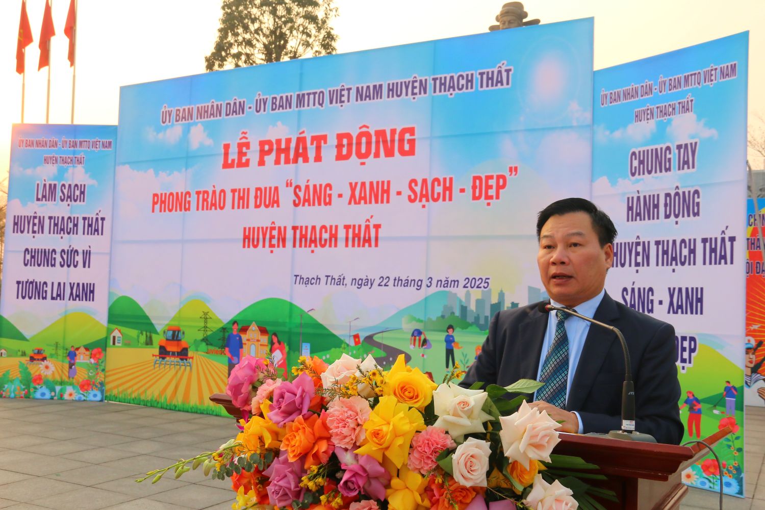 Tuy nhiên, để phong trào thi đua Sáng - Xanh - Sạch - Đẹp của Huyện không chỉ là phong trào thông thường mà trở thành việc làm thường xuyên mà ở đó có sự chung tay, đồng hành của từng người, từng nhà, từng đoàn thể, từng cơ quan, doanh nghiệp, hộ sản xuất kinh doanh và toàn thể cộng đồng trên địa bàn huyện góp phần đưa huyện Thạch Thất trở thành nơi đáng sống, phát triển bền vững cùng cả nước bước vào kỷ nguyên mới, kỷ nguyên vươn mình của dân tộc. Phát biểu tại buổi lễ, đồng chí Phùng Khắc Sơn – UVBTV Huyện ủy, Phó Chủ tịch UBND huyện đã kêu gọi các cấp ủy đảng, chính quyền, UBMTTQVN, các Hội đoàn thể và nhân dân tiếp tục thực hiện tốt một số nhiệm vụ trọng tâm: