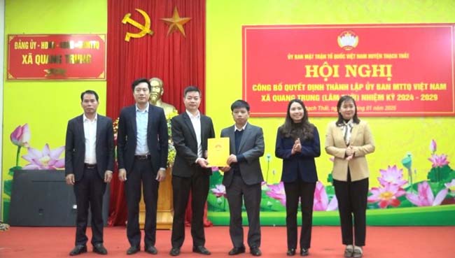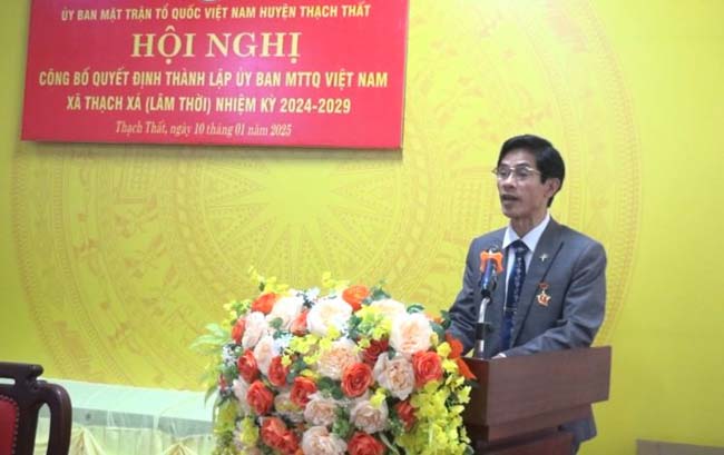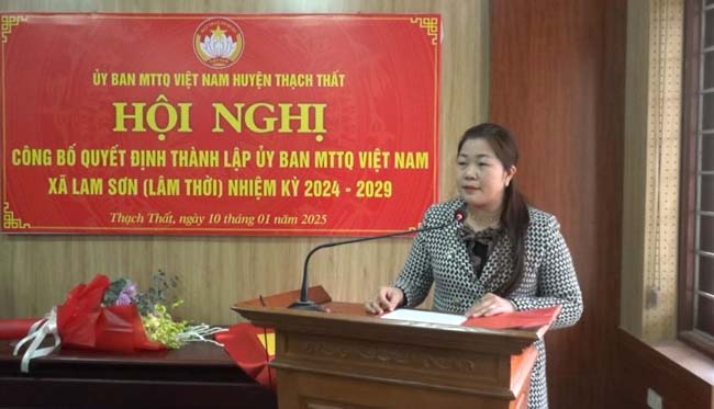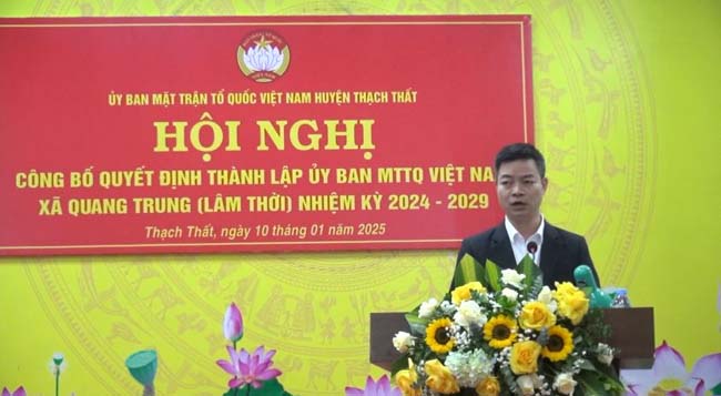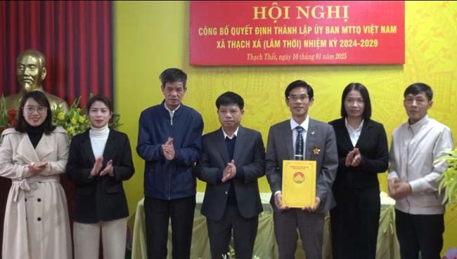 Tại hội nghị, đồng chí Nguyễn Hữu Hùng- Phó Chủ tịch Ủy ban MTTQ Việt Nam huyện đã công bố Quyết định của Ban Thường trực Ủy ban MTTQ Việt Nam huyện về việc thành lập Ủy ban MTTQ Việt Nam xã Thạch Xá (trên cơ sở sáp nhập Ủy ban MTTQ Việt Nam xã Thạch Xá, Chàng Sơn), công nhận Ủy viên Ủy ban MTTQ Việt Nam xã Thạch Xá nhiệm kỳ 2024- 2029 gồm 57 thành viên, Ban Thường trực gồm 6 thành viên, chỉ định ông Đặng Đình Thắng làm Chủ tịch, bà Nguyễn Thị Loan, bà Chu Thị Hà làm Phó Chủ tịch Ủy ban MTTQ Việt Nam xã Thạch Xá; thành lập Ủy ban MTTQ Việt Nam xã Lam Sơn (trên cơ sở sáp nhập Ủy ban MTTQ Việt Nam xã Dị Nậu, Canh Nậu), công nhận Ủy viên Ủy ban MTTQ Việt Nam xã Lam Sơn gồm 55 thành viên, Ban Thường trực gồm 6 thành viên, chỉ định bà Nguyễn Thị Nguyệt làm Chủ tịch, ông Nguyễn Huy Lý, bà Nguyễn Thị Thông, bà Nguyễn Thị Hằng làm Phó Chủ tịch Ủy ban MTTQ Việt Nam xã Lam Sơn; thành lập Ủy ban MTTQ Việt Nam xã Quang Trung (trên cơ sở sáp nhập Ủy ban MTTQ Việt Nam xã Bình Phú, Hữu Bằng), công nhận Ủy viên Ủy ban MTTQ Việt Nam xã Quang Trung gồm 70 thành viên, Ban Thường trực gồm 9 thành viên, chỉ định ông Nguyễn Khắc Bình làm Chủ tịch, ông Phan Lạc Đạt, ông Cấn Minh Chiến, ông Nguyễn Trọng Nghĩa làm Phó Chủ tịch Ủy ban MTTQ Việt Nam xã Quang Trung.