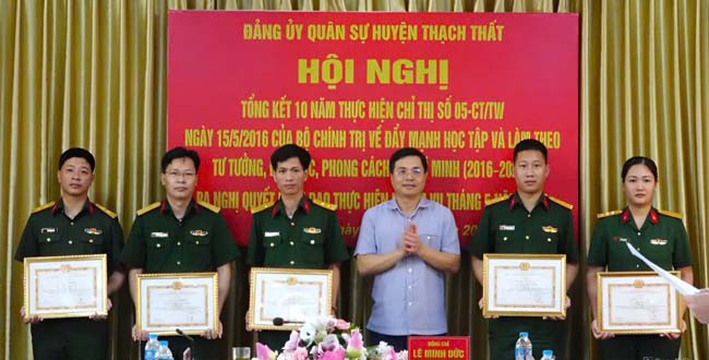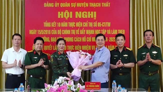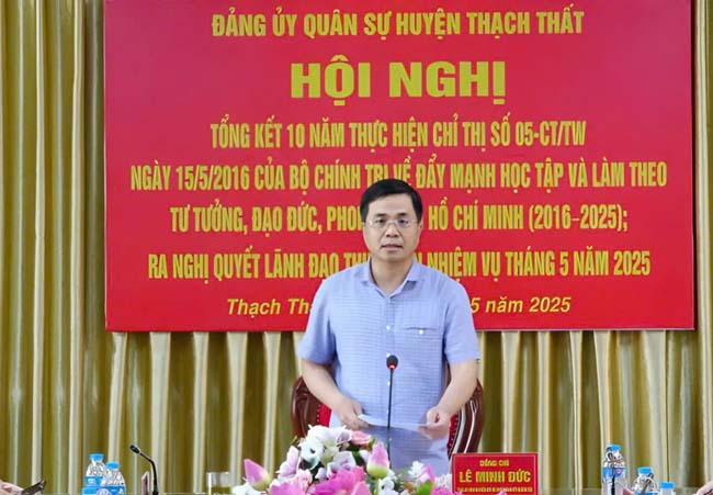 06/05/2025Chiều ngày 05/5/2025, Đảng ủy Quân sự huyện Thạch Thất tổ chức Hội nghị tổng kết 10 năm thực hiện Chỉ thị số 05 ngày 15/5/2016 của Bộ Chính trị về đẩy mạnh học tập và làm theo tư tưởng, đạo đức, phong cách Hồ Chí Minh; ra Nghị quyết lãnh đạo thực hiện nhiệm vụ tháng 5/2025. Đồng chí Lê Minh Đức- Thành ủy viên, Bí thư Huyện ủy, Bí thư Đảng ủy Quân sự huyện dự, chủ trì Hội nghị.
