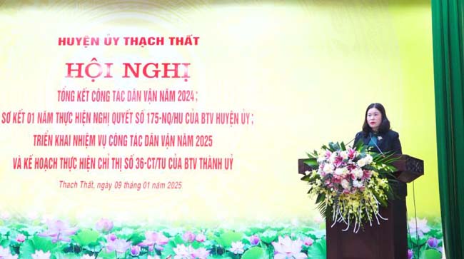 Báo cáo tại hội nghị, đồng chí Đỗ Thị Bích- Ủy viên Ban Thường vụ- Trưởng Ban Dân vận Huyện ủy nhấn mạnh, năm 2024, Huyện ủy Thạch Thất đã ban hành 82 văn bản lãnh đạo, chỉ đạo triển khai thực hiện công tác dân vận trên các lĩnh vực. Lãnh đạo thực hiện có hiệu quả Quy chế phối hợp công tác dân vận của hệ thống chính trị huyện. Chú trọng nâng cao chất lượng phong trào thi đua dân vận khéo gắn với thực hiện nhiệm vụ chính trị của địa phương, cơ quan, đơn vị. Tăng cường công tác quản lý nhà nước về tín ngưỡng, tôn giáo. Đẩy mạnh tuyên truyền, quán triệt, cụ thể hóa triển khai Luật Thực hiện dân chủ ở cơ sở.