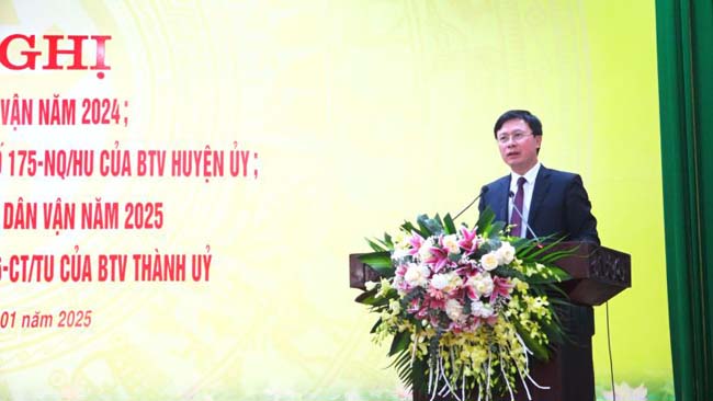 Về nhiệm vụ trọng tâm năm 2025, đồng chí Phó Bí thư Thường trực Huyện ủy- Chủ tịch HĐND huyện đề nghị các cấp ủy Đảng, chính quyền, MTTQ, các đoàn thể chính trị- xã hội tổ chức quán triệt sâu sắc, cụ thể hóa quan điểm chỉ đạo của đồng chí Tổng Bí thư Tô Lâm về “kỷ nguyên mới, kỷ nguyên vươn mình của dân tộc Việt Nam” để tổ chức thực hiện; tập trung thực hiện hoàn thành các mục tiêu, chỉ tiêu, nhiệm vụ, giải pháp theo Chương trình hành động thực hiện Nghị quyết Đại hội Đảng bộ các cấp về công tác dân vận; đẩy mạnh phong trào thi đua “Dân vận khéo”; tham mưu triển khai có hiệu quả Luật Thực hiện dân chủ ở cơ sở; tiếp tục lãnh đạo, chỉ đạo tổ chức quán triệt Nghị quyết số 175 của Ban Thường vụ Huyện ủy một cách thường xuyên, sâu rộng, hiệu quả;...