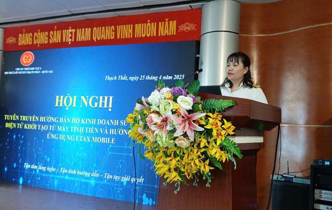 Phát biểu tại Hội nghị, đồng chí Nguyễn Thị Thu Thủy- Phó Đội trưởng Đội Thuế liên huyện Thạch Thất- Quốc Oai cho biết, thời gian qua, Chi cục Thuế khu vực I và UBND huyện Thạch Thất đã có nhiều văn bản chỉ đạo về công tác quản lý thuế đối với hộ, cá nhân kinh doanh gắn với chuyển đổi số và sử dụng hóa đơn điện tử khởi tạo từ máy tính tiền với mục tiêu: 100% hộ khoán được công khai thông tin trên bản đồ số; 100% hộ mới kinh doanh, hộ khoán, hộ kê khai đăng ký tài khoản giao dịch điện tử, eTax Mobile; 90% hộ đăng ký eTax Mobile liên kết tài khoản ngân hàng; hộ, cá nhân kinh doanh thuộc diện triển khai hóa đơn điện tử khởi tạo từ máy tính sẽ sử dụng trước ngày 15/5/2025;...
