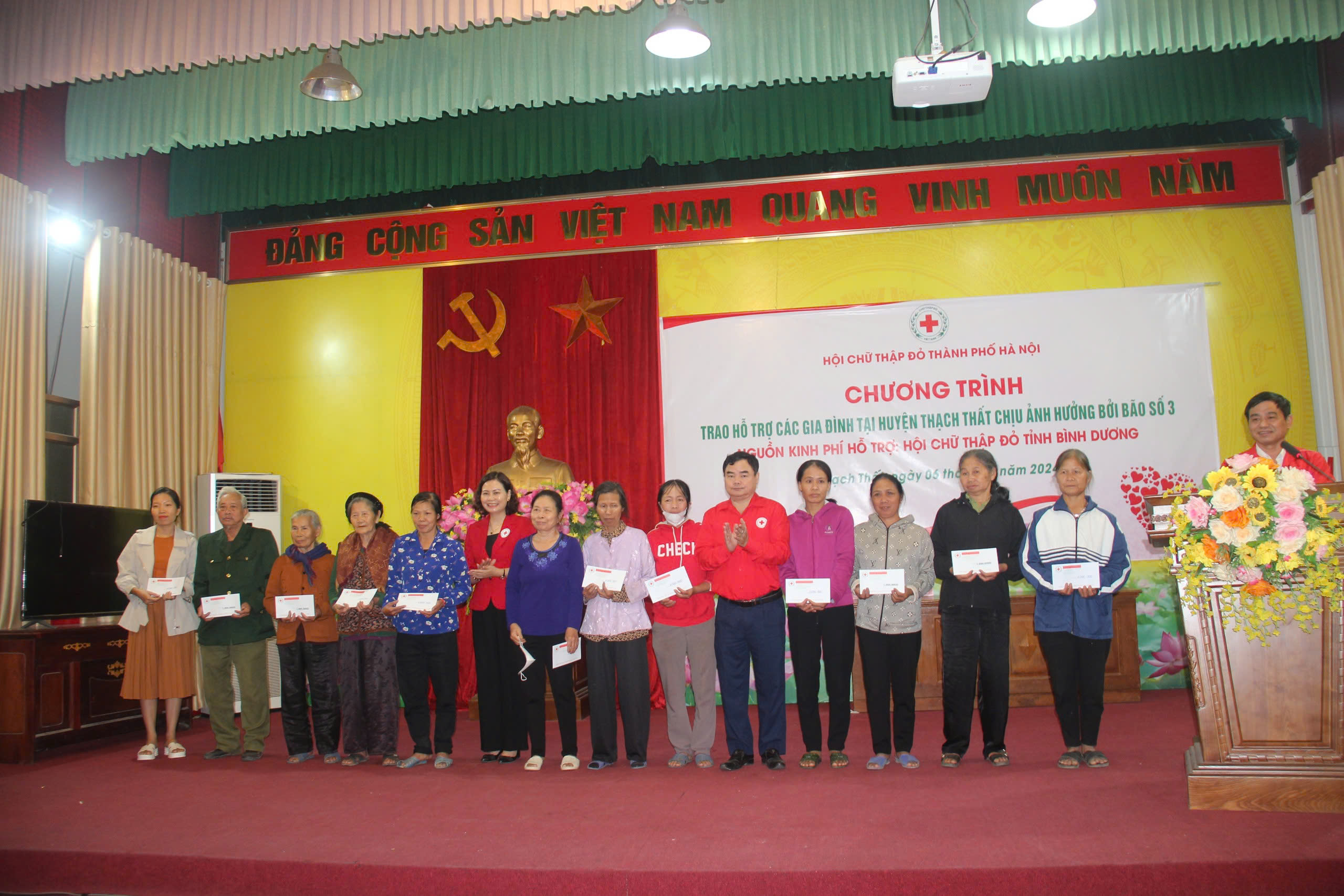 Tại hội nghị, Lãnh đạo Hội chữ thập đỏ Thành phố Hà Nội, Hội chữ thập đỏ huyện Thạch Thất trao 50 xuất quà cho 50 hộ gia đình bị ảnh hưởng do bão số 3 và hoàn lưu sau bão, tại 5 xã: Phú Kim, Lại Thượng, Cần Kiệm, Kim Quan và Thị trấn Liên Quan. Mỗi phần quà trị giá 1 triệu đồng. Nguồn kinh phí hỗ trợ từ Hội chữ thập đỏ tỉnh Bình Dương. Đây là tình cảm, là tấm lòng của Hội chữ thập đỏ tỉnh Bình Dương đã quan tâm, hỗ trợ, giúp đỡ cho những gia đình bị ảnh hưởng bởi siêu bão số 3 tại huyện Thạch Thất. Món quà thật đáng quý đối với các hộ gia đình, phần nào giúp đỡ các gia đình vượt qua khó khăn, vươn lên trong cuộc sống./.