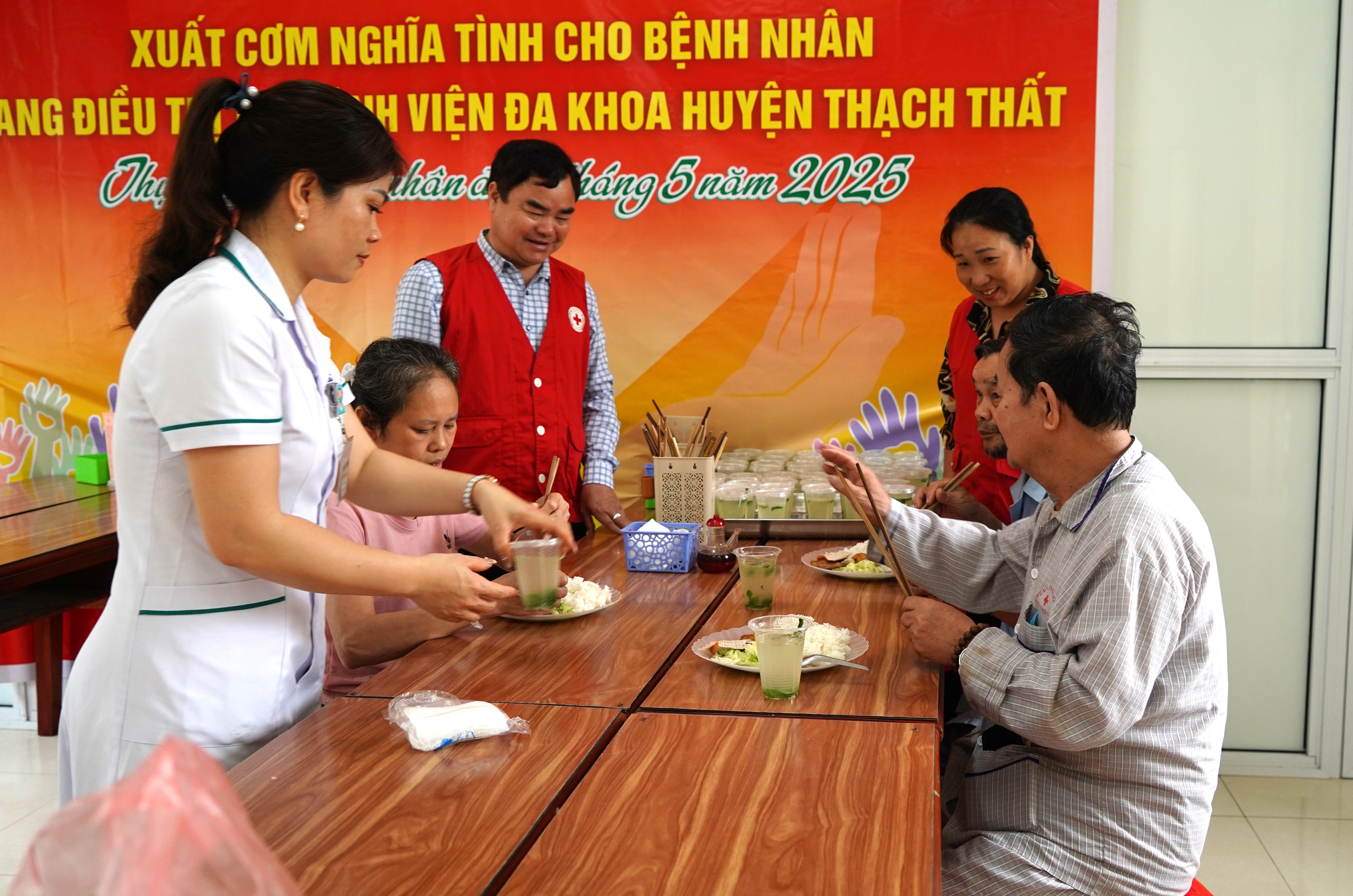 03/05/2025Hưởng ứng Tháng Nhân đạo - Tháng 5 năm 2025, sáng ngày 29/4/2025, Hội Chữ thập đỏ Huyện Thạch Thất phối hợp với Bệnh viện đa khoa Huyện, trụ trì Chùa Bảo Quang xã Lam Sơn, trụ trì Chùa Hưng Sơn xã Lại Thượng, tổ chức trao tặng suất cơm nghĩa tình cho các bệnh nhân đang điều trị tại Bệnh viện đa khoa Huyện Thạch Thất.