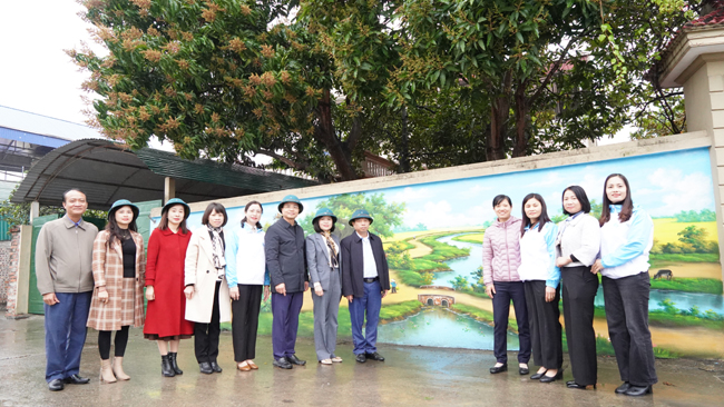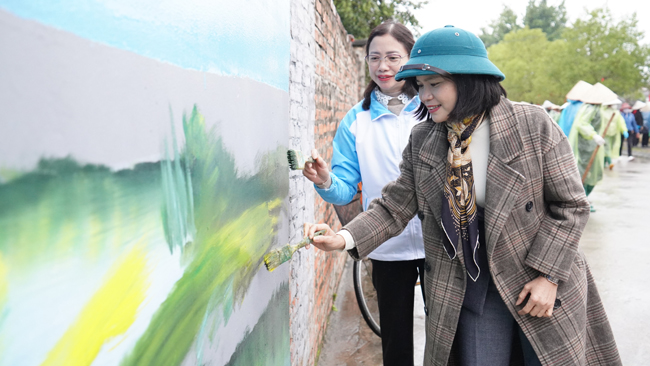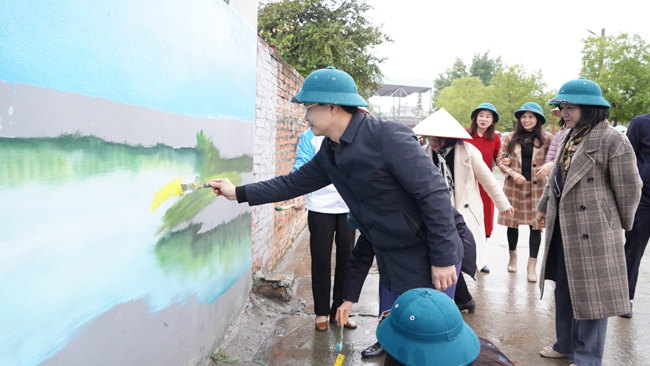 Ngay sau buổi lễ, các đại biểu đã tiến hành trồng và vẽ 4 bức tranh tường bích họa tại Vườn hoa công viên Đình thôn 2, xã Đại Đồng.