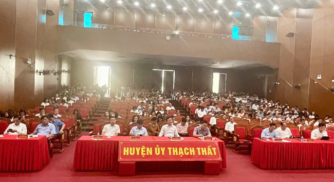 Dự tại điểm cầu Trung tâm Văn hoá- Thông tin và Thể thao huyện Thạch Thất, có đồng chí Lê Minh Đức- TUV- Bí thư Huyện ủy; đồng chí Nguyễn Mạnh Hồng- Phó Bí thư Huyện ủy- Chủ tịch UBND huyện; đồng chí Nguyễn Minh Hồng- Phó Bí thư Thường trực Huyện ủy- Chủ tịch HĐND huyện; các đồng chí ủy viên BTV Huyện ủy; Uỷ viên BCH Đảng bộ huyện khóa 24, nhiệm kỳ 2020- 2025;….cùng toàn thể cán bộ, Đảng viên chi bộ các Ban Đảng Huyện ủy, Trung tâm chính trị, MTTQ, các tổ chức chính trị xã hội huyện, các cơ quan hành chính, đơn vị sự nghiệp thuộc UBND huyện.