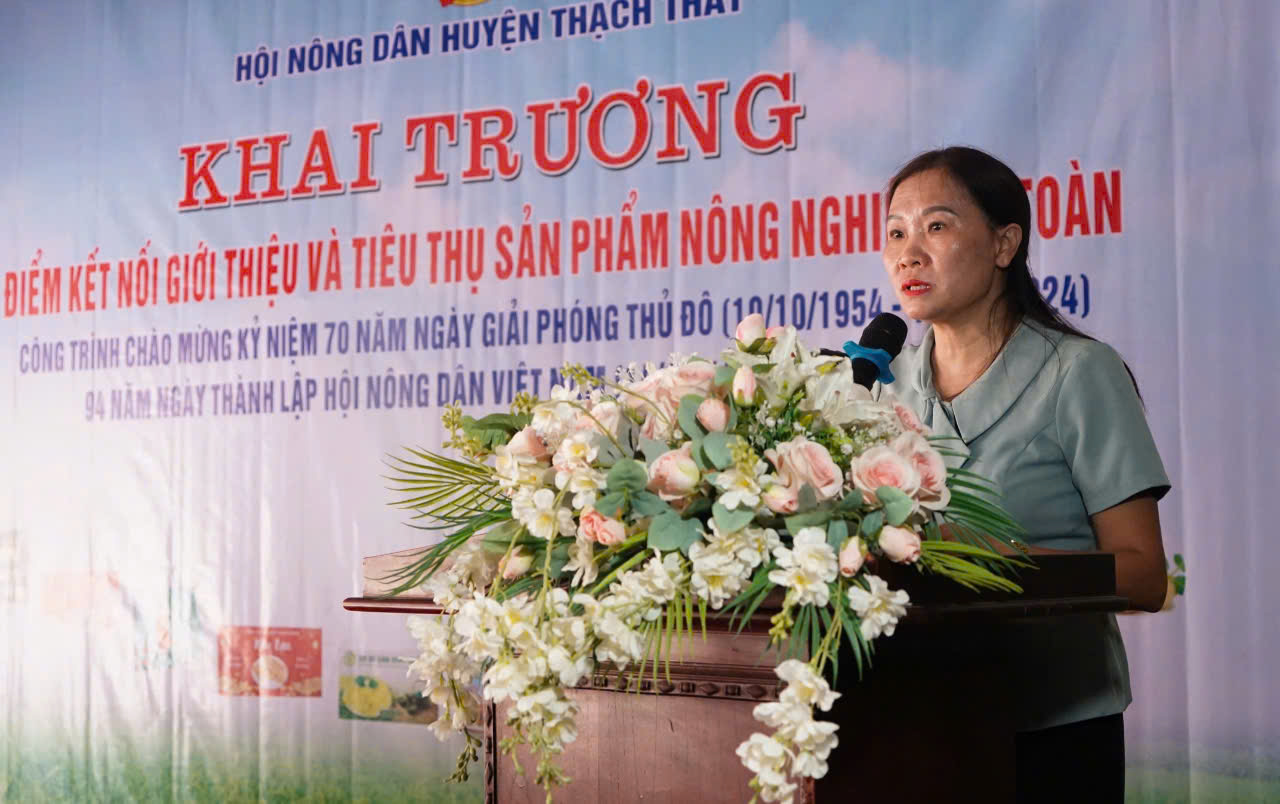 Phát biểu khai mạc, đồng chí Vương Thị Thảo- HUV- Chủ tịch Hội Nông dân huyện Thạch Thất cho biết: Trong thời gian qua, các cấp Hội Nông dân huyện đã tích cực hỗ trợ nông dân ứng dụng chuyển đổi số và liên kết hợp tác, tích cực tham gia xây dựng nông thôn mới nâng cao, nông thôn mới kiểu mẫu. Khai trương điểm kết nối giới thiệu và tiêu thụ sản phẩm nông nghiệp an toàn tại xã Đại Đồng với mong muốn kết nối giữa các hợp tác xã, làng nghề, hộ nông dân sản xuất nông nghiệp sạch trên địa bàn huyện, tìm đầu ra ổn định cho sản phẩm nông nghiệp an toàn; tạo thu nhập ổn định và nâng cao giá trị cho sản phẩm nông nghiệp sạch, giúp phát triển bền vững. Đây cũng là địa chỉ tin cậy giúp người dân trên địa bàn lựa chọn, sử dụng các sản phẩm nông nghiệp sạch, an toàn.