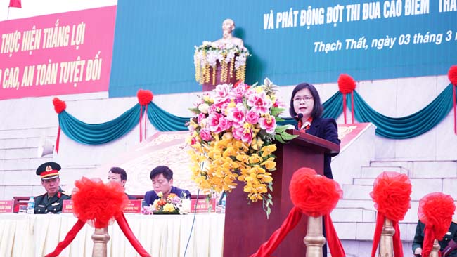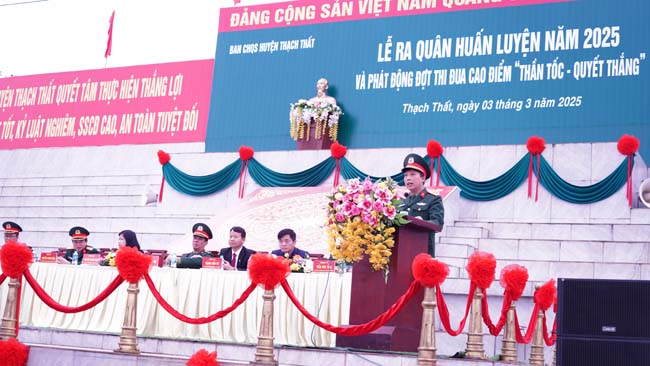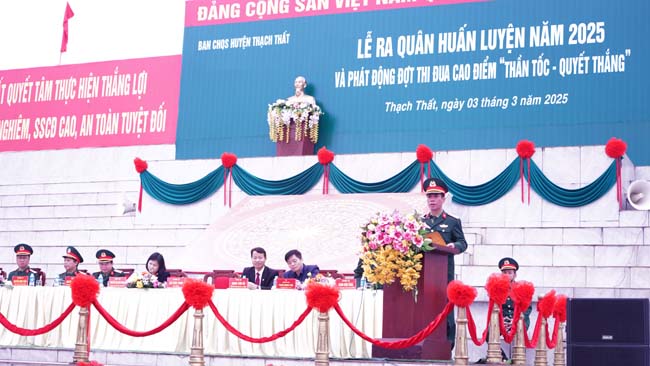 04/03/2025Sáng ngày 03/3, tại sân vận động huyện Thạch Thất, Ban Chỉ huy Quân sự huyện Thạch Thất tổ chức Lễ ra quân huấn luyện năm 2025 và phát động đợt thi đua cao điểm “Thần tốc- Quyết thắng. Đồng chí Nguyễn Thị Bích Ngọc- Ủy viên Ban Thường vụ Huyện ủy, Phó Chủ tịch UBND huyện; đại diện Bộ Tư lệnh Thủ đô Hà Nội dự, chỉ đạo.