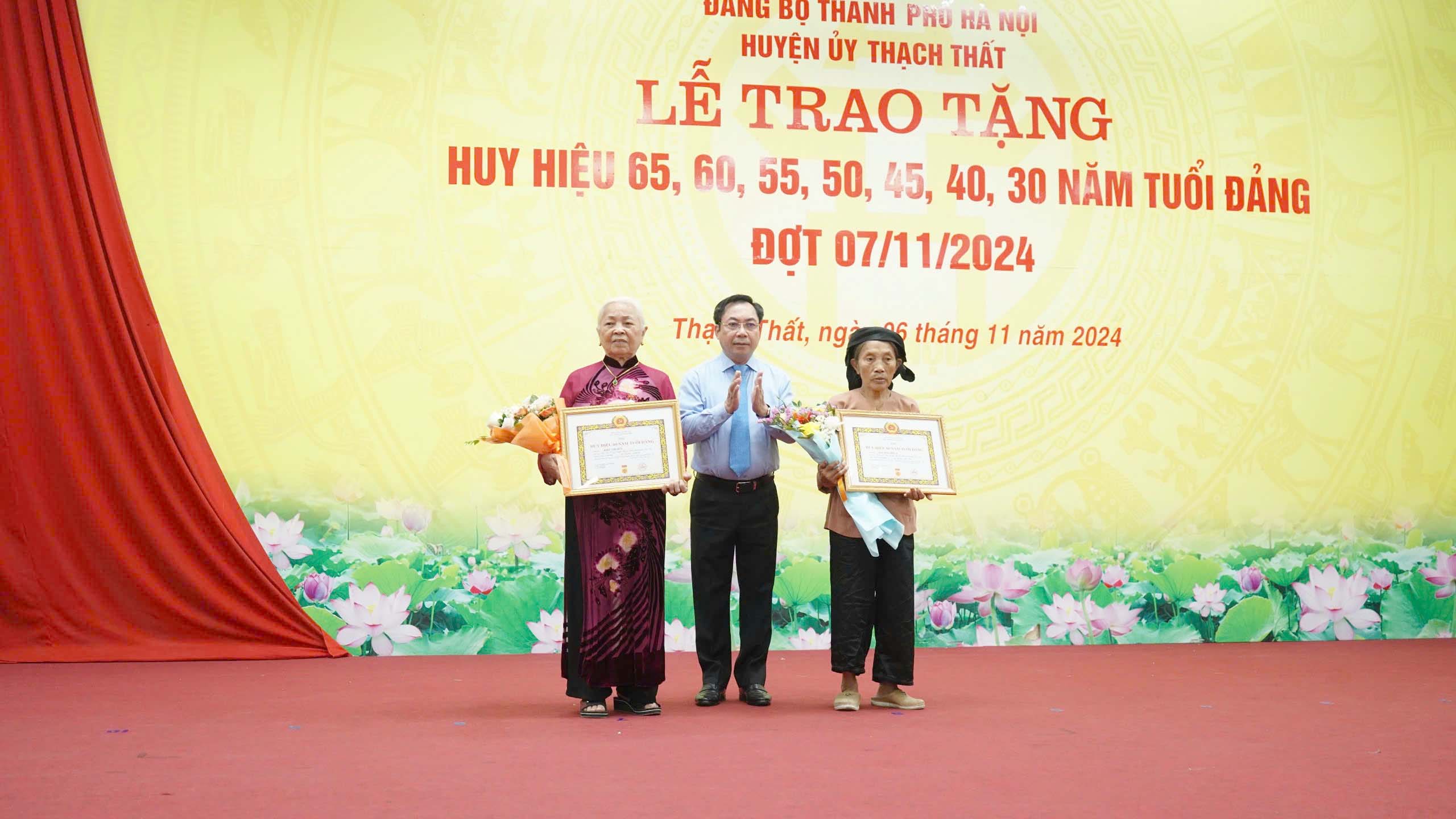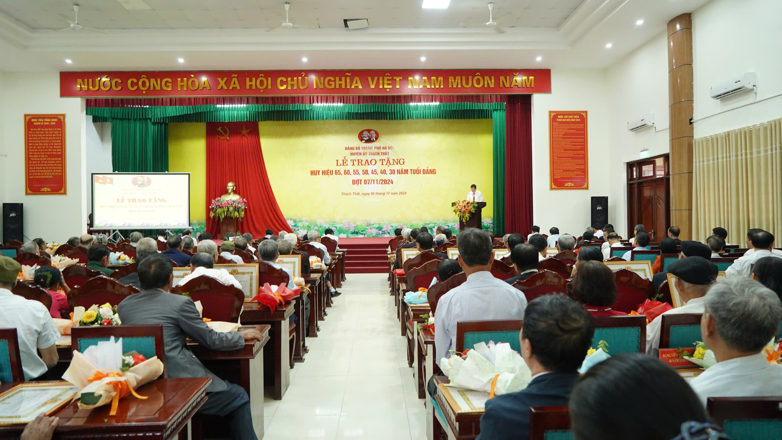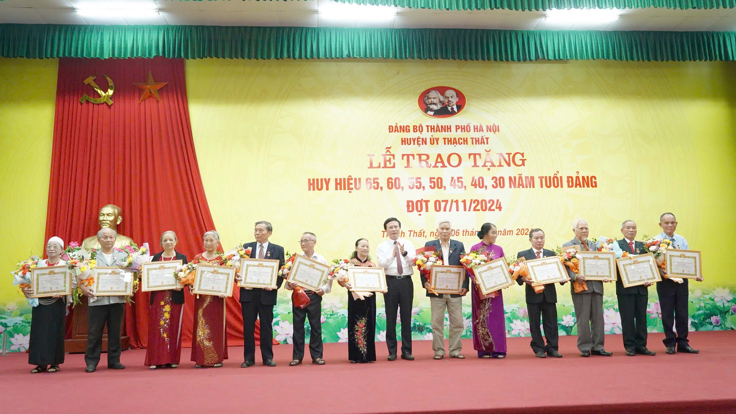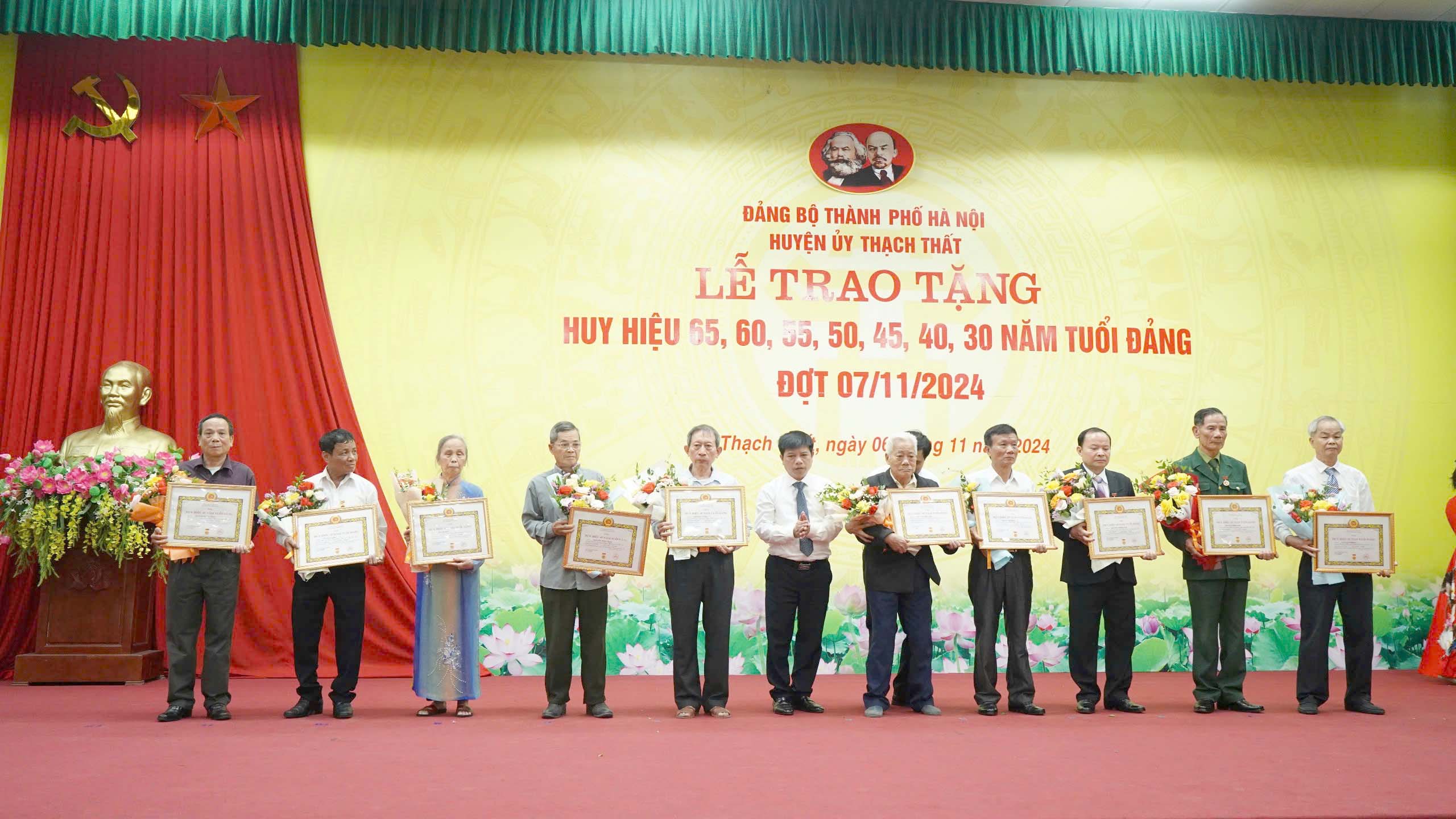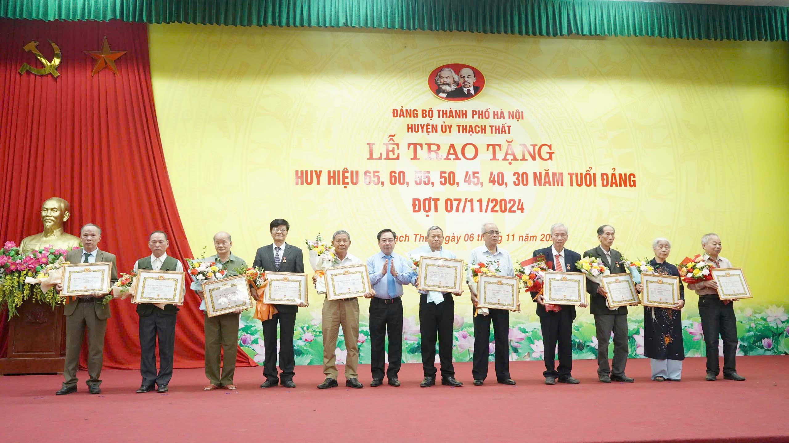 Dịp này, Đảng bộ huyện Thạch Thất có 118 đảng viên được trao tặng Huy hiệu Đảng, trong đó 3 đồng chí vinh dự nhận huy hiệu 65 năm tuổi Đảng, 2 đồng chí được nhận Huy hiệu 60 năm tuổi Đảng, 14 đồng chí được nhận Huy hiệu 55 năm tuổi Đảng, 11 đồng chí được nhận Huy hiệu 50 năm tuổi Đảng, 34 đồng chí nhận Huy hiệu 45 năm tuổi Đảng, 33 đồng chí nhận huy hiệu 40 năm tuổi Đảng và 21 đồng chí nhận Huy hiệu 30 năm tuổi Đảng.