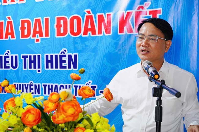 Đồng chí Phí Văn Hưng- Phó Chủ tịch UB MTTQ huyện phát biểu chúc mừng các gia đình được nhận nhà Đại đoàn kết