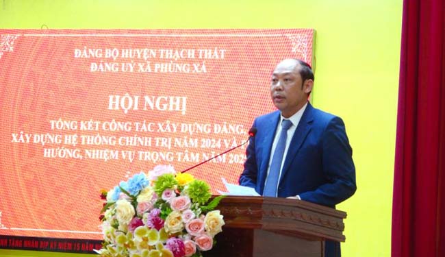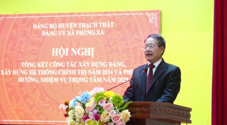 Phát biểu chỉ đạo tại hội nghị, đồng chí Phó Chủ tịch HĐND huyện Thạch Thất đã chúc mừng các đảng viên trong Đảng bộ xã Phùng Xá vinh dự được trao tặng Huy hiệu Đảng; đồng thời biểu dương, ghi nhận, đánh giá cao những kết quả đạt được của Đảng bộ xã Phùng Xá trong năm 2024. Chỉ đạo, định hướng một số nhiệm vụ trọng tâm thời gian tới, đồng chí đề nghị Ban Chấp hành Đảng bộ xã Phùng Xá rà soát lại các chỉ tiêu nhiệm kỳ 2020- 2025, kịp thời ban hành kế hoạch công tác năm, kế hoạch khắc phục những tồn tại, hạn chế đã được chỉ ra tại kỳ kiểm điểm năm 2024; chuẩn bị tốt các điều kiện tổ chức Đại hội chi bộ, tiến tới Đại hội Đảng bộ xã nhiệm kỳ 2025- 2030; duy trì, thực hiện nghiêm quy chế làm việc của Ban Chấp hành; quan tâm lãnh đạo, chỉ đạo thực hiện có trọng tâm, trọng điểm các nhiệm vụ chính trị của địa phương;...