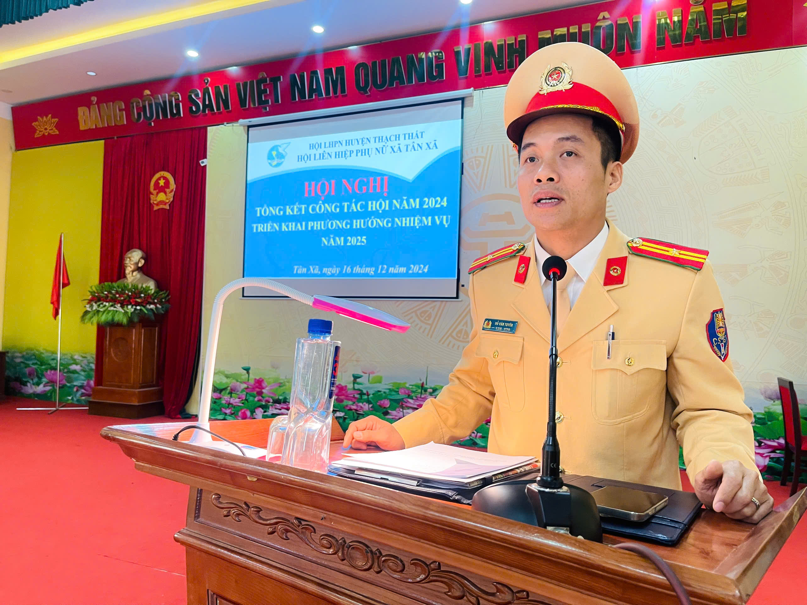 Sau hội nghị tổng kết, Hội LHPN xã cũng đã phối hợp với Công an huyện Thạch Thất tổ chức tuyên truyền Luật An toàn giao thông đường bộ và văn hoá khi tham gia giao thông. Đại uý Đỗ Văn Tuyên – Cán bộ Đội CSGT, Công an huyện Thạch Thất dự và trực tiếp làm báo cáo viên./.