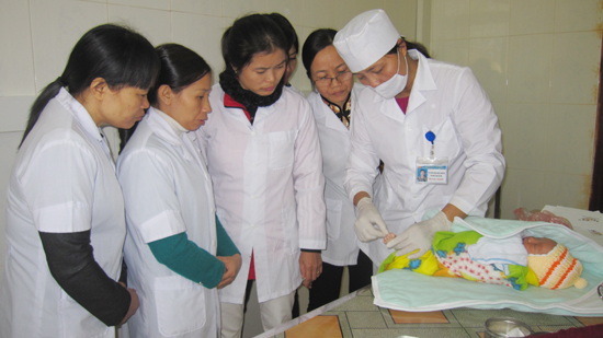 Sau học lý thuyết, các học viên được thực hành thực tế lấy máu gót chân của trẻ tại khoa sản Bệnh viện huyện Thạch Thất do cán bộ khoa sản bệnh viện huyện Thạch Thất hướng dẫn trong thời gian 3 buổi sáng từ 3-5/12/2013.