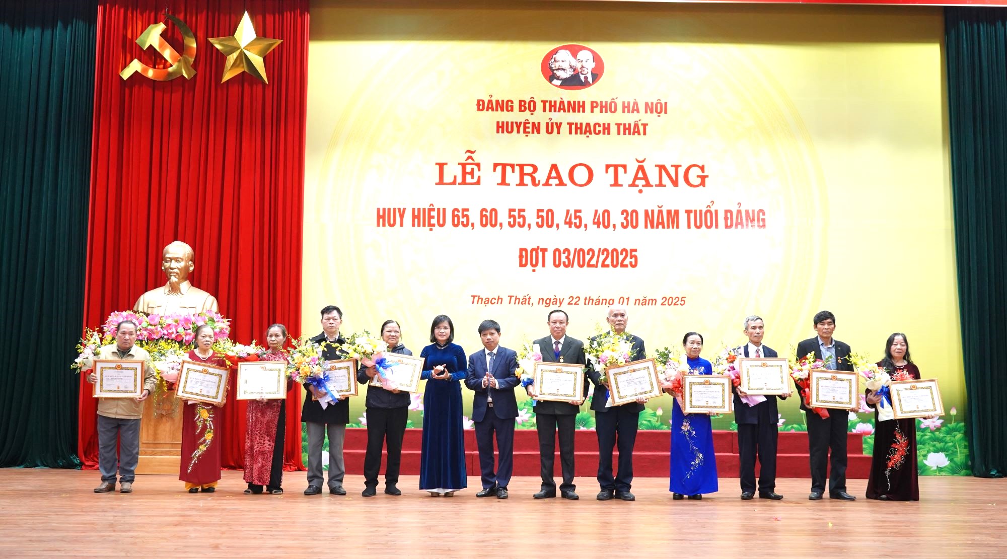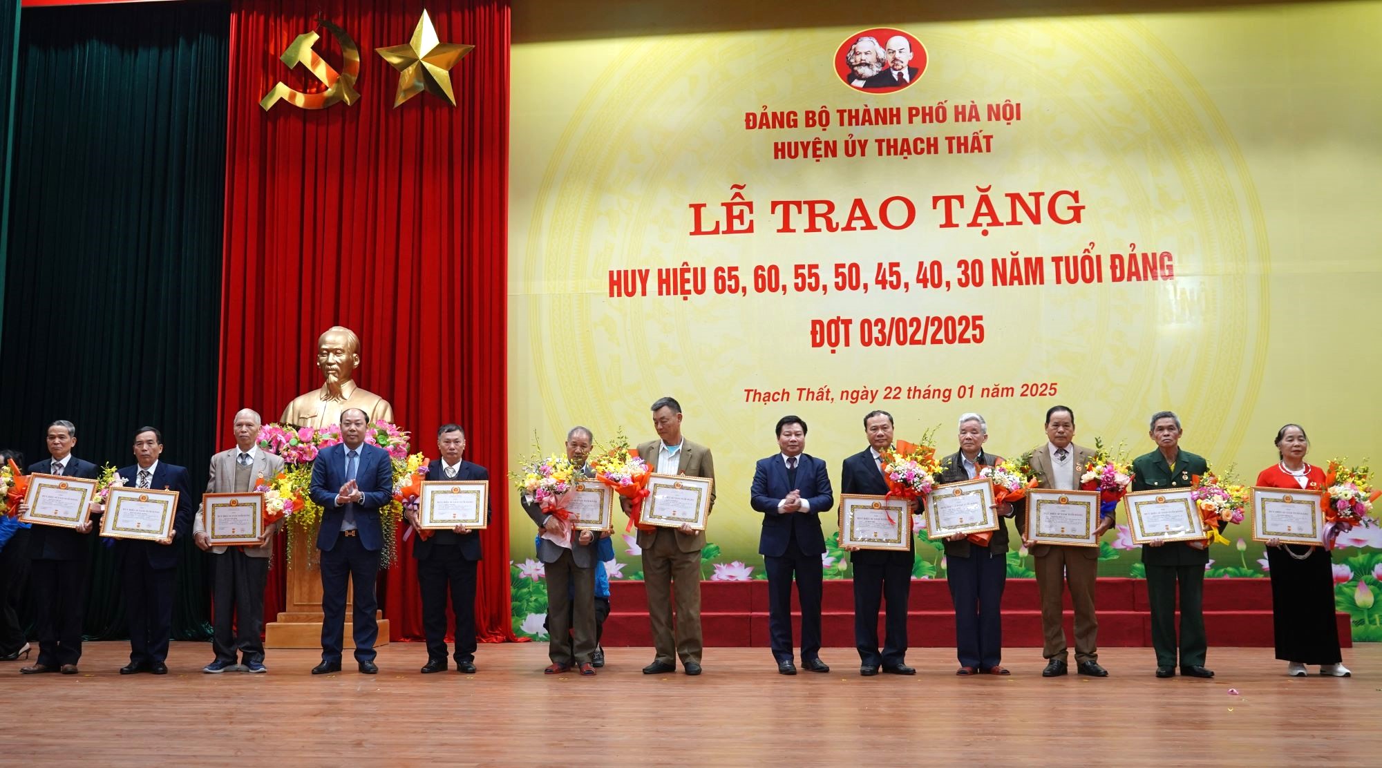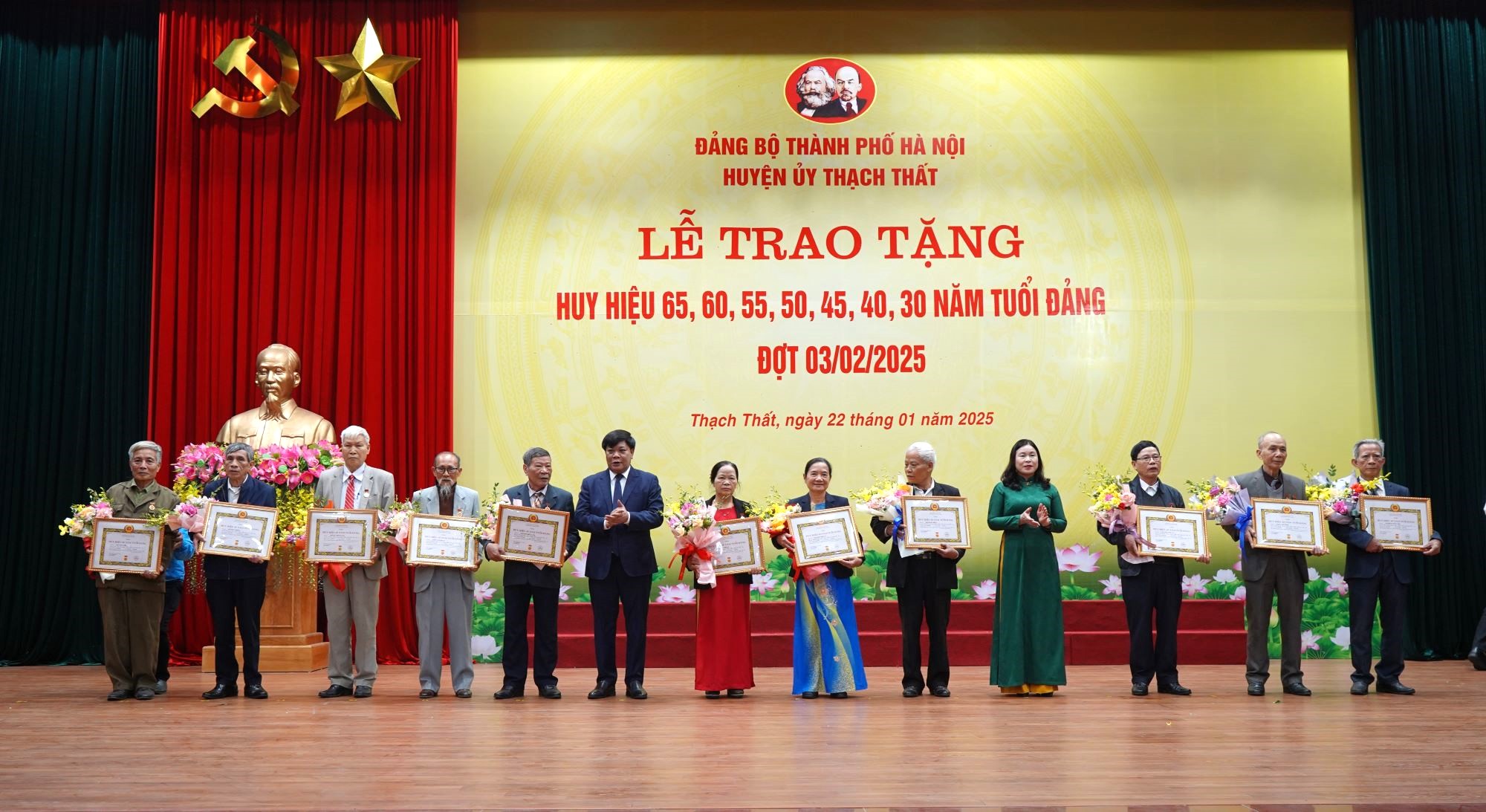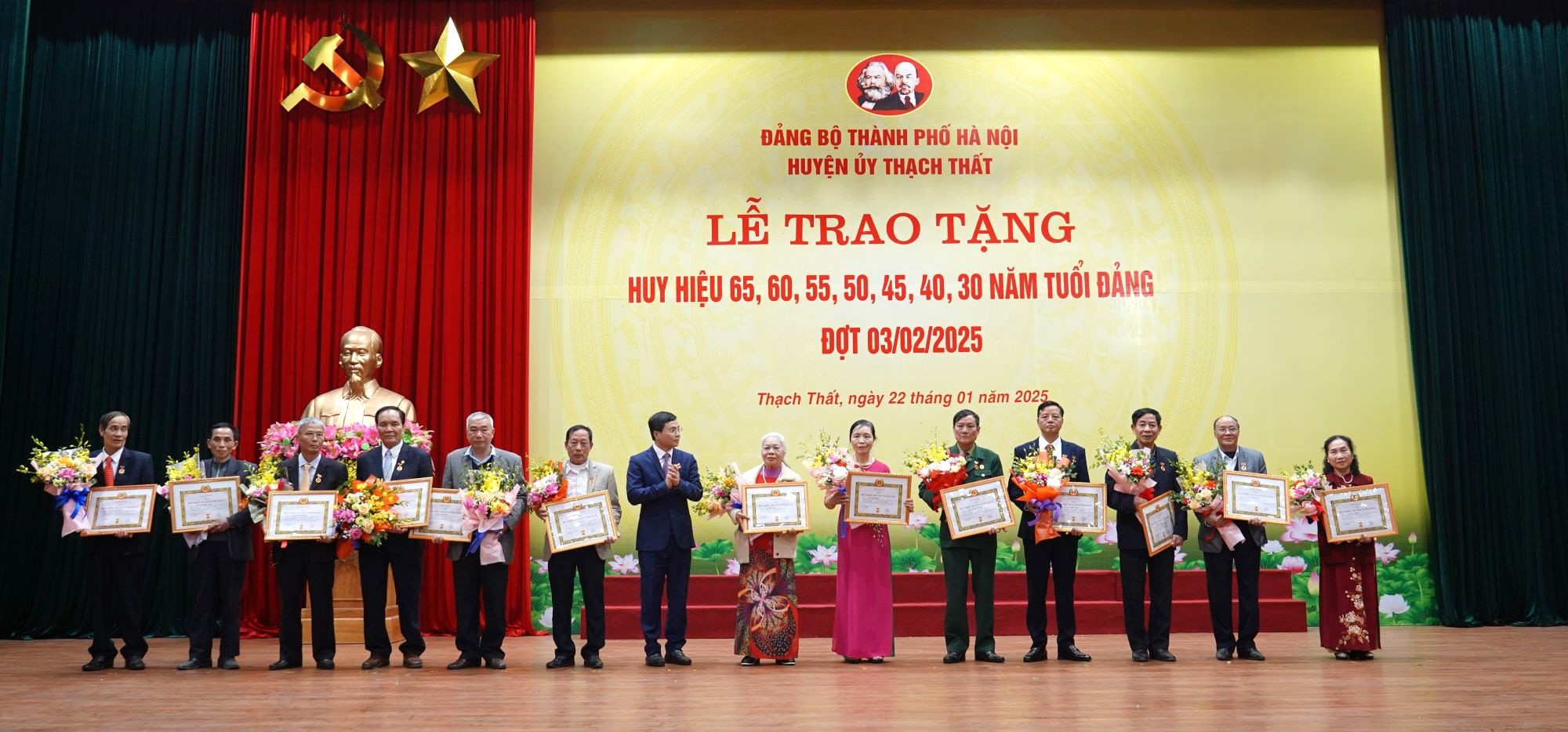 Trong đợt trao huy hiệu Đảng đợt 3/2/2025, Đảng bộ huyện Thạch Thất có 204 đồng chí được trao huy hiệu Đảng, trong đó có 12 đồng chí nhận huy hiệu 65 năm; 9 đồng chí nhận huy hiệu 60 năm, 14 đồng chí nhận huy hiệu 55 năm, 16 đồng chí nhận huy hiệu 50 năm, 52 đồng chí nhận huy hiệu 45 năm, 52 đồng chí nhận huy hiệu 40 năm, 49 đồng chí nhận huy hiệu 30 năm tuổi Đảng.