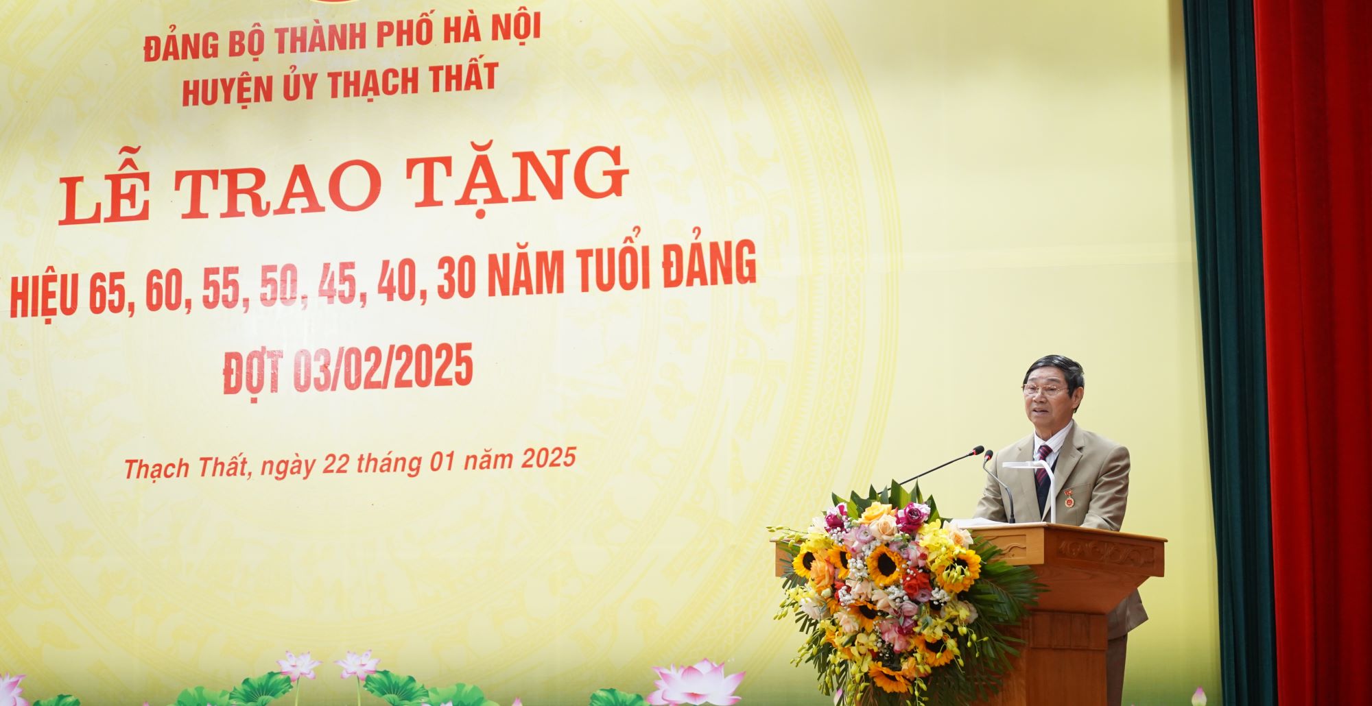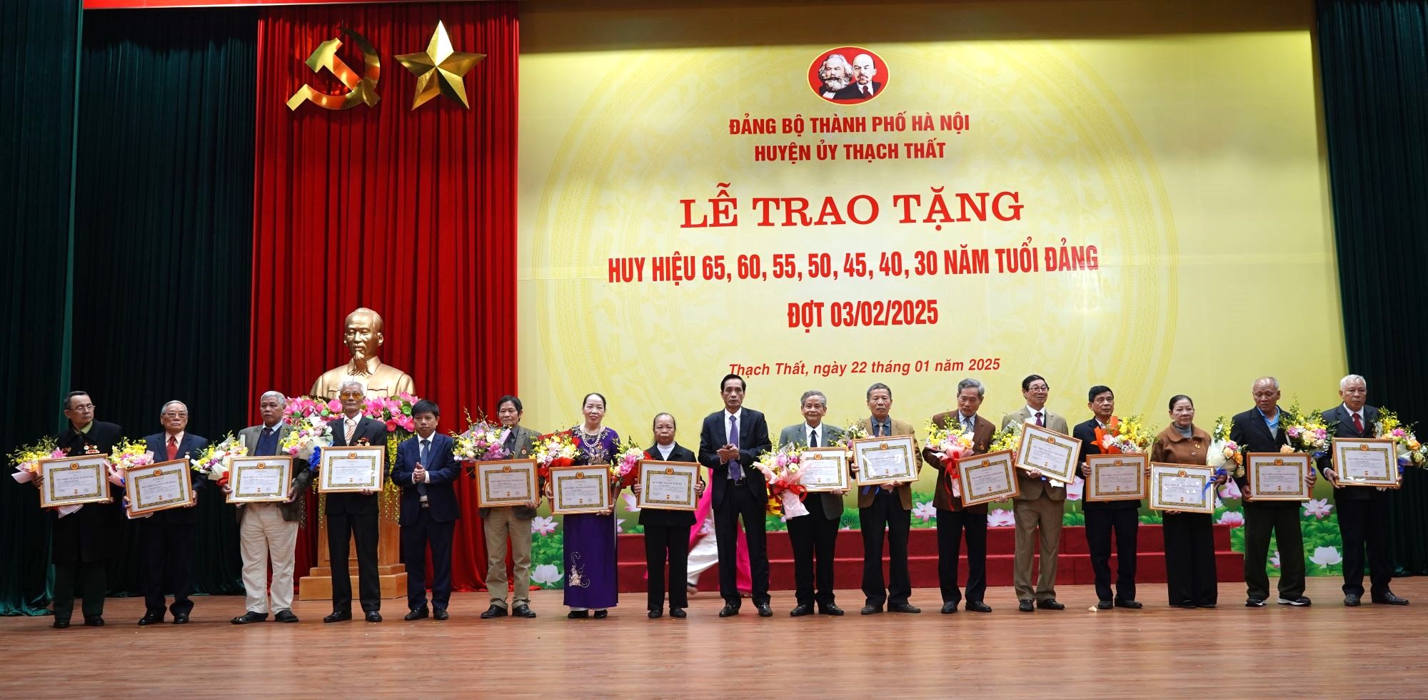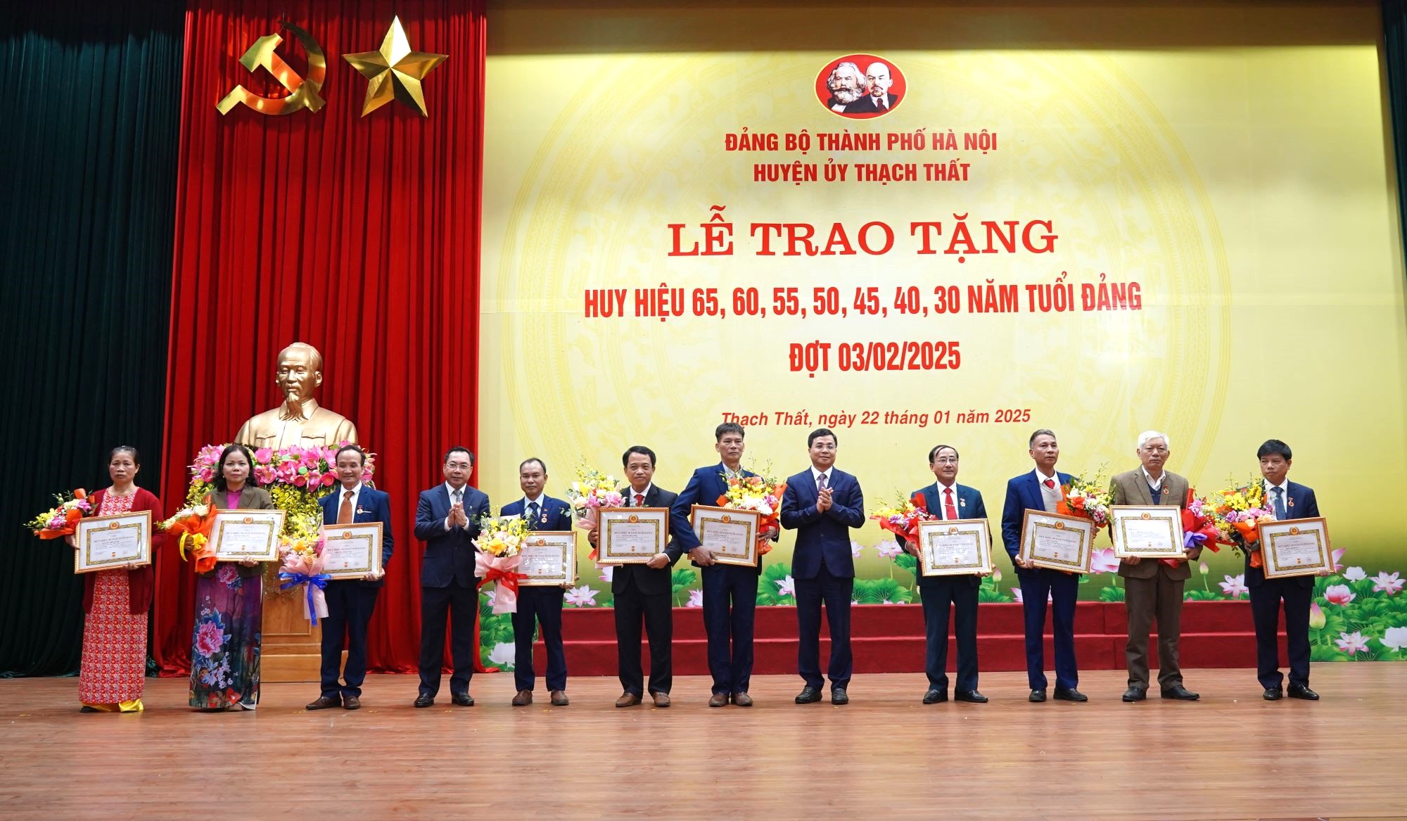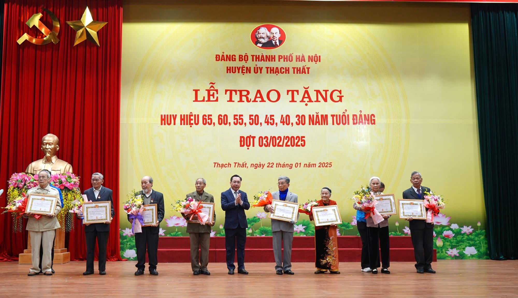 Trong đợt trao huy hiệu Đảng đợt 3/2/2025, Đảng bộ huyện Thạch Thất có 204 đồng chí được trao huy hiệu Đảng, trong đó có 12 đồng chí nhận huy hiệu 65 năm; 9 đồng chí nhận huy hiệu 60 năm, 14 đồng chí nhận huy hiệu 55 năm, 16 đồng chí nhận huy hiệu 50 năm, 52 đồng chí nhận huy hiệu 45 năm, 52 đồng chí nhận huy hiệu 40 năm, 49 đồng chí nhận huy hiệu 30 năm tuổi Đảng.
