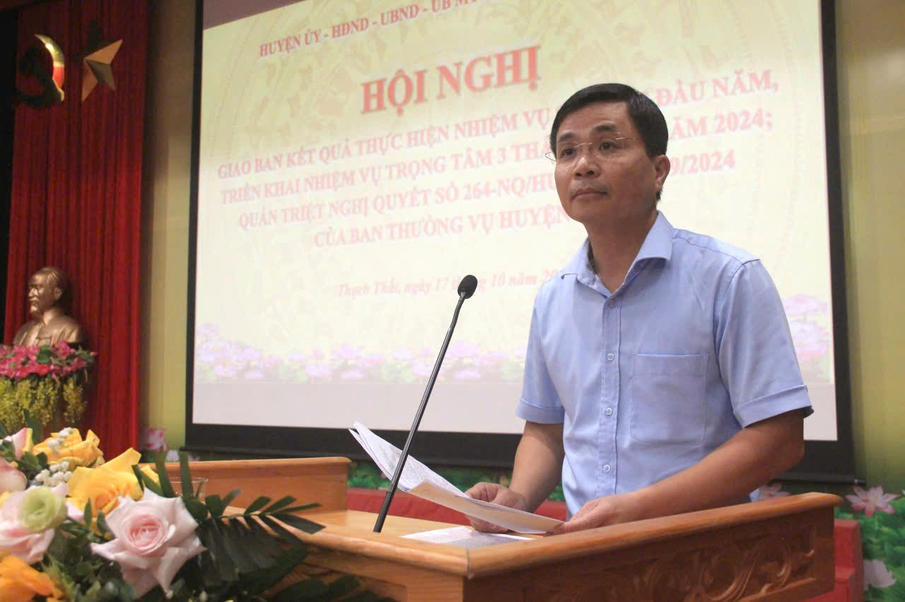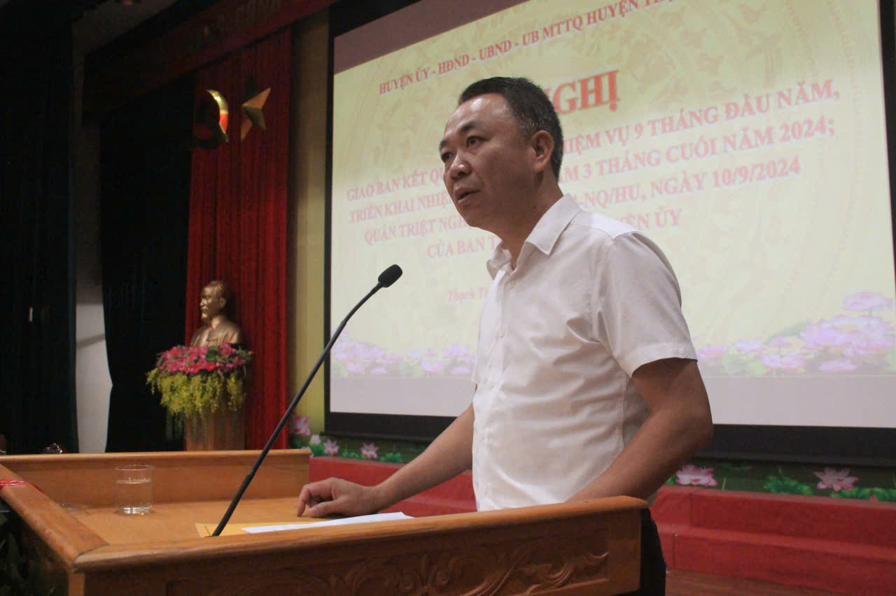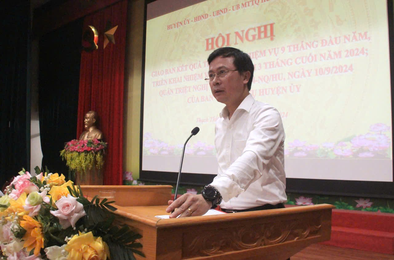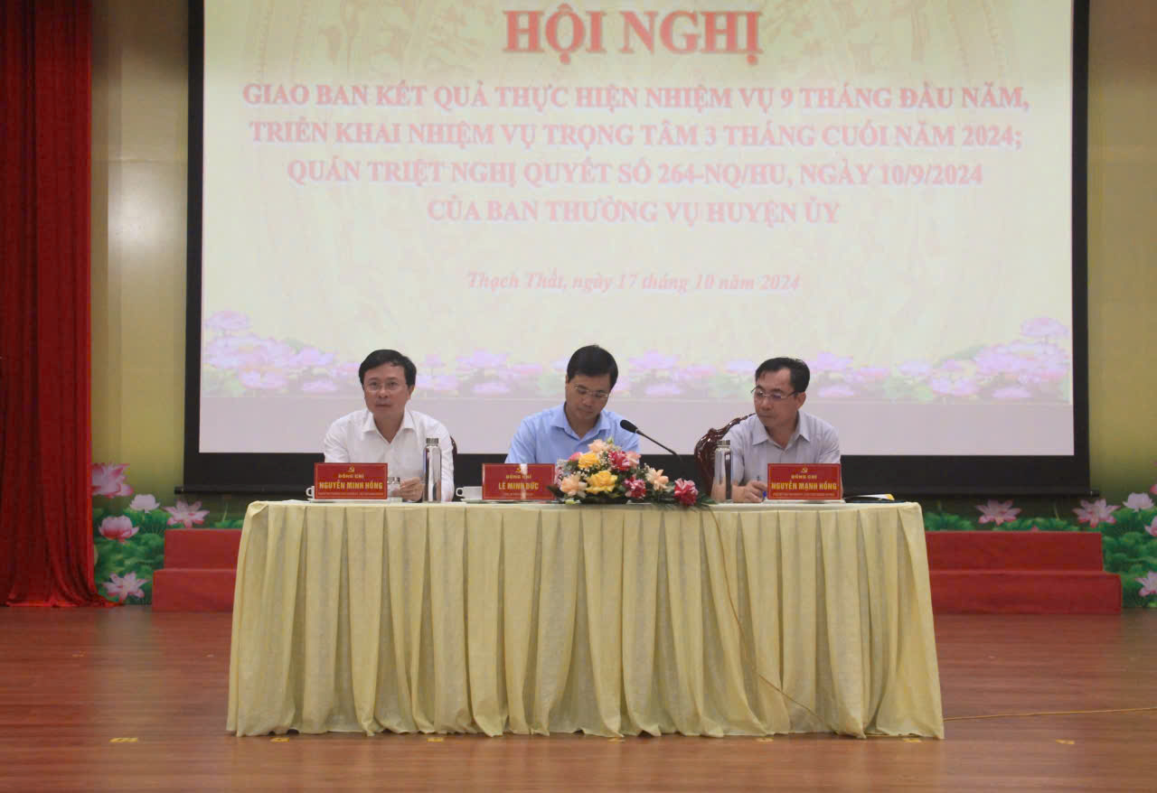 Sáng ngày 17/10, tại Hội trường Trung tâm Văn hóa- Thông tin và Thể thao huyện Thạch Thất, BTV Huyện ủy tổ chức hội nghị giao ban đánh giá kết quả thực hiện nhiệm vụ phát triển kinh tế - xã hội, quốc phòng, an ninh; công tác xây dựng Đảng 9 tháng đầu năm, nhiệm vụ trọng tâm 3 tháng cuối năm 2024. 361 đại biểu tham dự hội nghị.