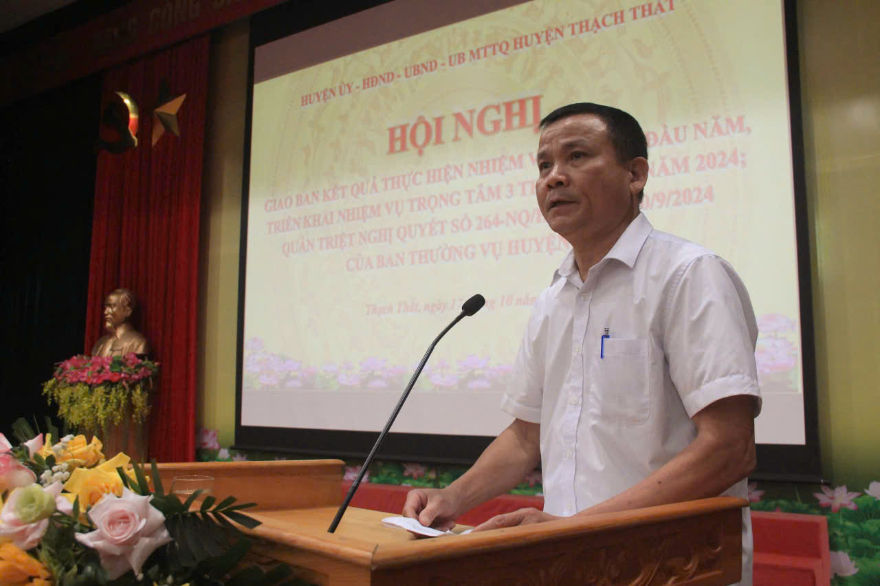 Tại hội nghị, đồng chí Nguyễn Minh Hồng- Phó Bí thư Thường trực Huyện ủy- Chủ tịch HĐND huyện quán triệt Nghị quyết số 264 ngày 10/9/2024 của BTV Huyện ủy Thạch Thất về nâng cao hiệu lực, hiệu quả công tác bồi thường, hỗ trợ, tái định cư khi nhà nước thu hồi đất trên địa bàn huyện Thạch Thất giai đoạn 2024-2025 và những năm tiếp theo. Theo đó BTV Huyện ủy đề ra 7 giải pháp trọng tâm để thực hiện Nghị quyết.