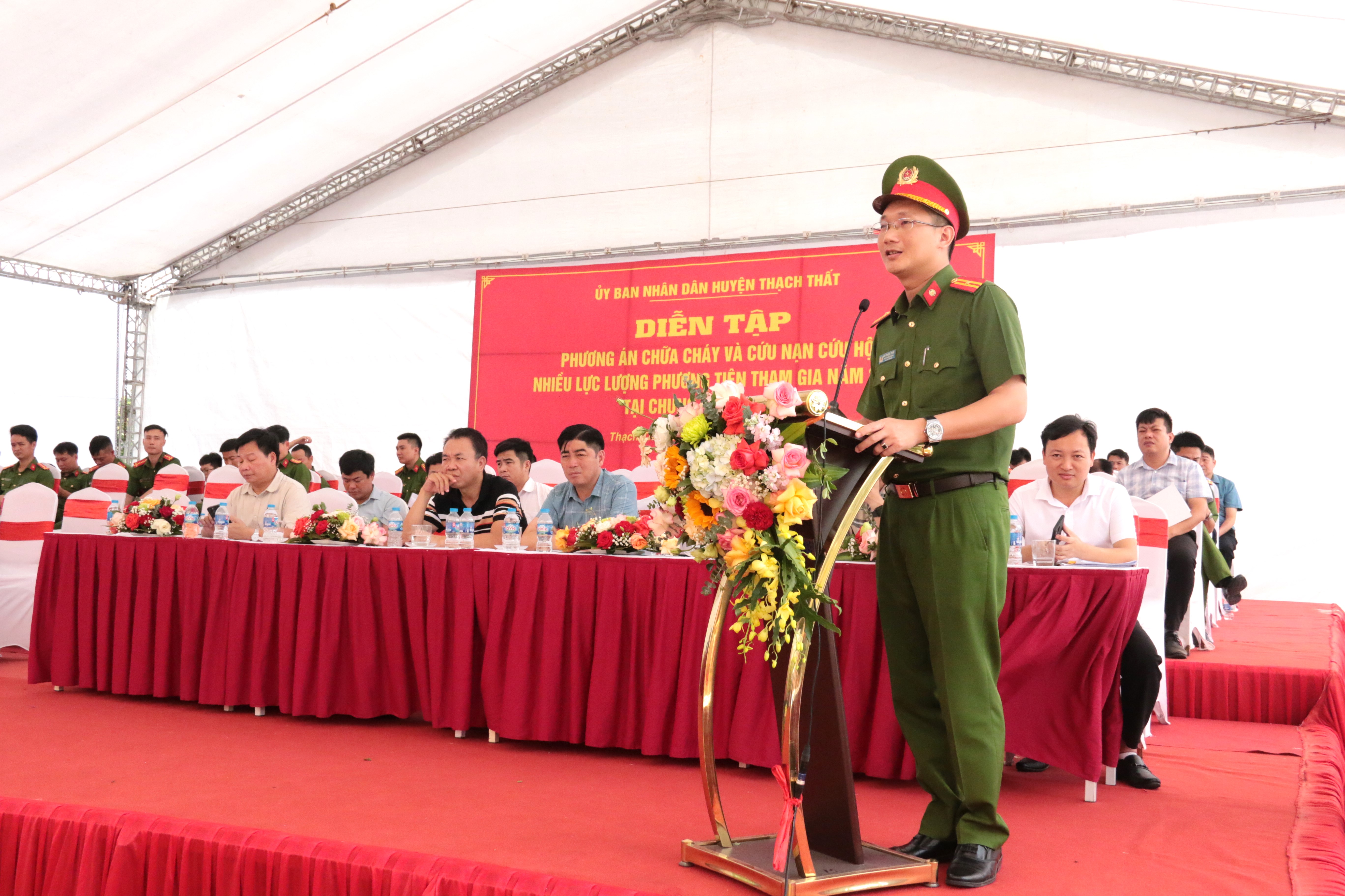 Thiếu tá Nguyễn Đức Thắng - Phó Trưởng phòng Cảnh sát PCCC&CNCH, Công an thành phố Hà Nội phát biểu tại buổi diễn tập