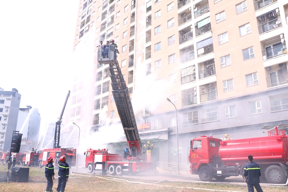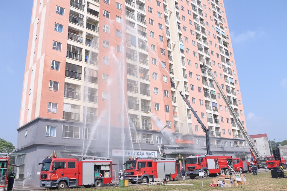 Cuộc diễn tập có sự tham gia của 250 người và 12 xe chữa cháy cùng các phương tiện chữa cháy của cơ sở. Tình huống giả định được đặt ra: Đám cháy xuất phát từ siêu thị tại tầng 1 toà nhà do nơi đây tập trung nhiều chất dễ cháy như cồn, túi nilon, nhựa tổng hợp... khiến ngọn lửa đã phát triển nhanh tỏa ra nhiều khói, khí độc khói nhanh chóng lan rộng toàn bộ khu vực tầng 1 và các khu vực xung quanh, theo các kẽ hở, đường ống kỹ thuật thông tầng lên các tầng trên vào hành lang dẫn tới khó khăn cho việc thoát nạn của cư dân. Ngay khi phát hiện cháy, bảo vệ toà nhà đã báo động cháy cho mọi người biết và gọi điện báo cháy cho Đội PCCC cơ sở. Nhận tin báo cháy, các lực lượng và phương tiện đã được huy động khẩn trương đến hiện trường, triển khai công tác chữa cháy và cứu nạn, cứu hộ.
