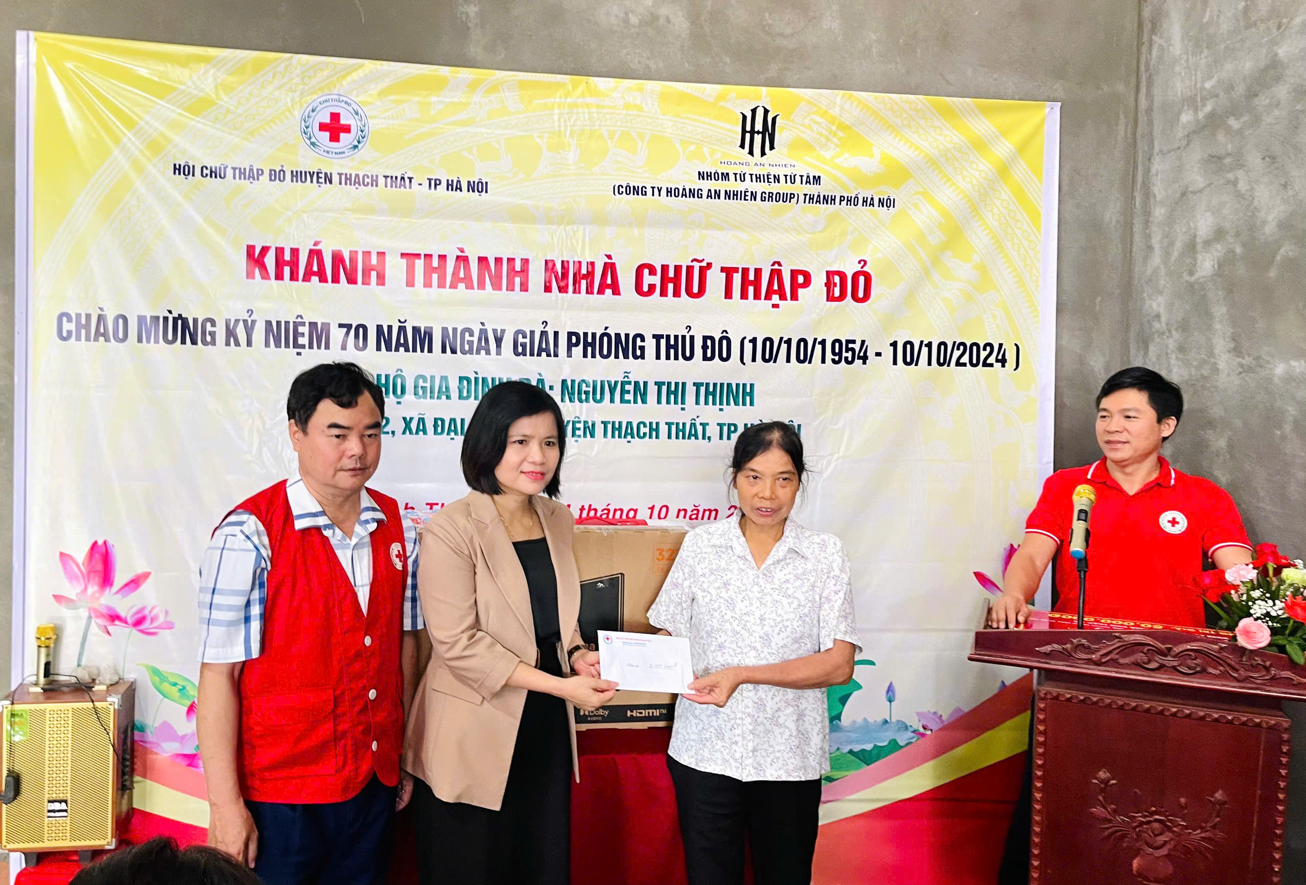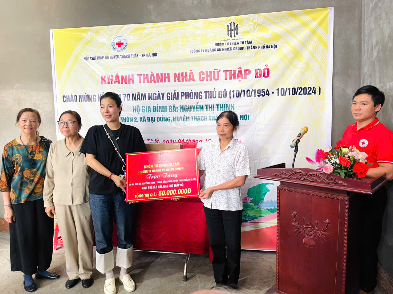 Nhóm Từ thiện từ tâm - Công ty Hoàng An Nhiên Group hỗ trợ gia đình bà Thịnh 50 triệu đồng để xây dựng ngôi nhà Chữ thập đỏ
