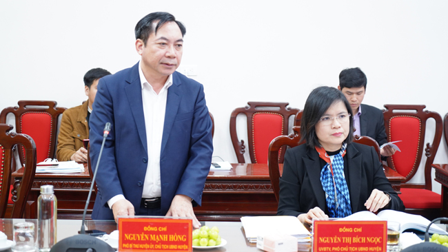 Đồng chí Nguyễn Mạnh Hồng- Phó Bí thư Huyện ủy- Chủ tịch UBND huyện phát biểu tại Hội nghị