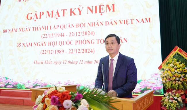 Phát biểu tại Hội nghị, thay mặt lãnh đạo Huyện ủy- HĐND- UBND- UB MTTQ huyện Thạch Thất, đồng chí Bí thư Huyện ủy Lê Minh Đức trân trọng gửi đến các Bà mẹ Việt Nam anh hùng; Anh hùng Lực lượng vũ trang nhân dân, các đồng chí thương binh, bệnh binh, gia đình liệt sỹ, người có công với cách mạng; các đồng chí tướng lĩnh, sỹ quan cao cấp và cán bộ, chiến sỹ lực lượng vũ trang huyện những tình cảm thân thiết, lời chúc mừng nồng nhiệt nhất nhân dịp Kỷ niệm 80 năm ngày thành lập Quân đội nhân dân Việt Nam và 35 năm ngày Hội Quốc phòng toàn dân.