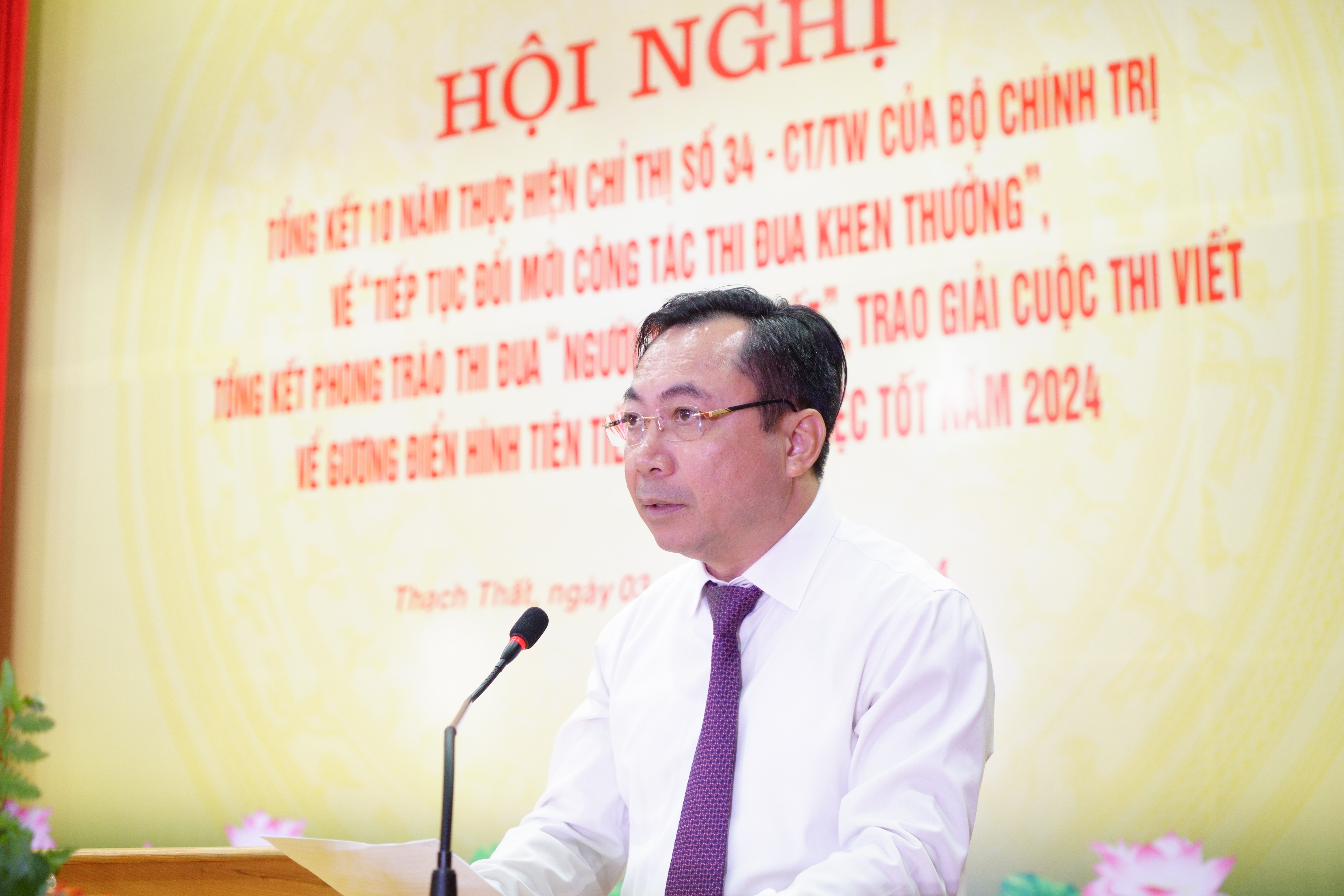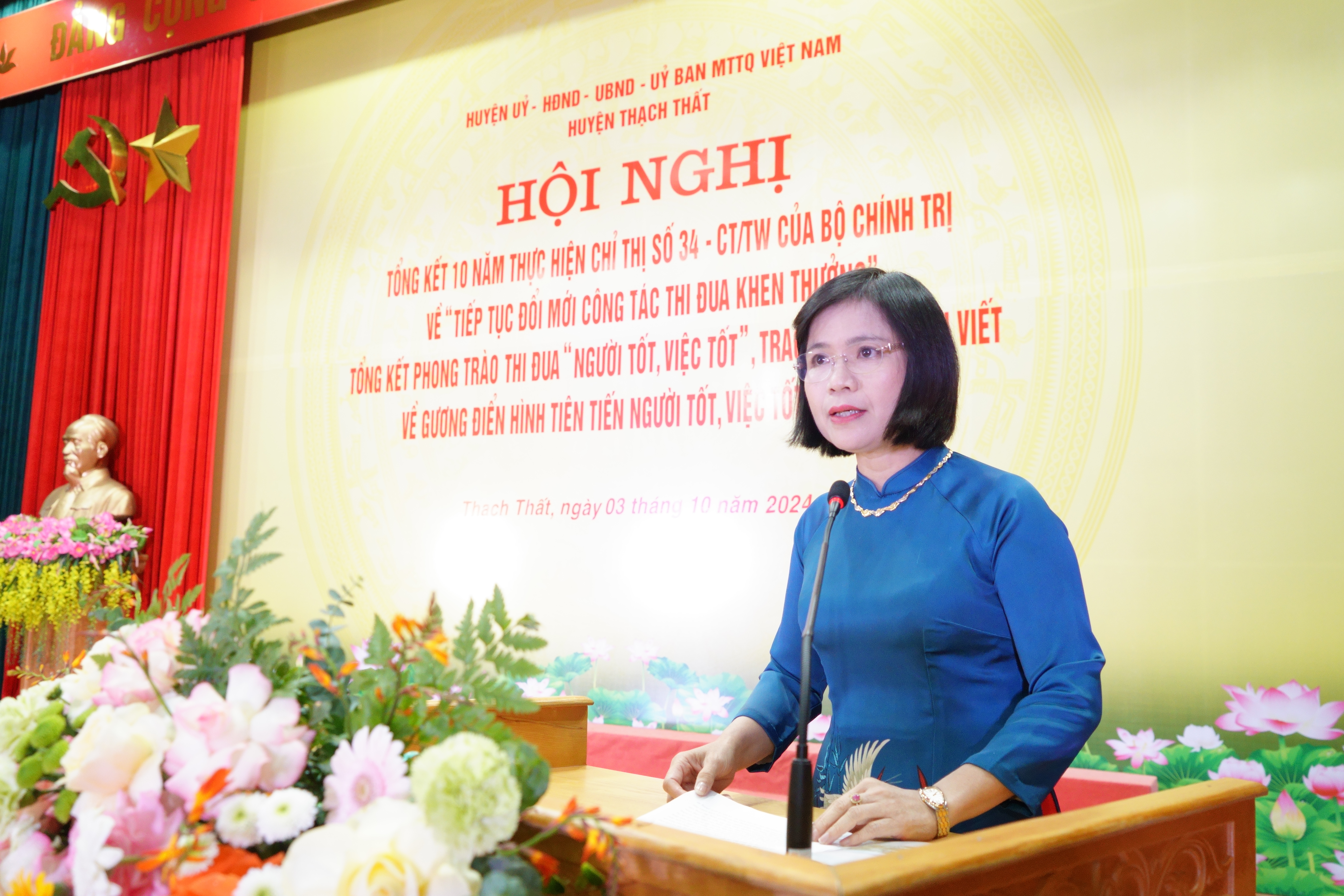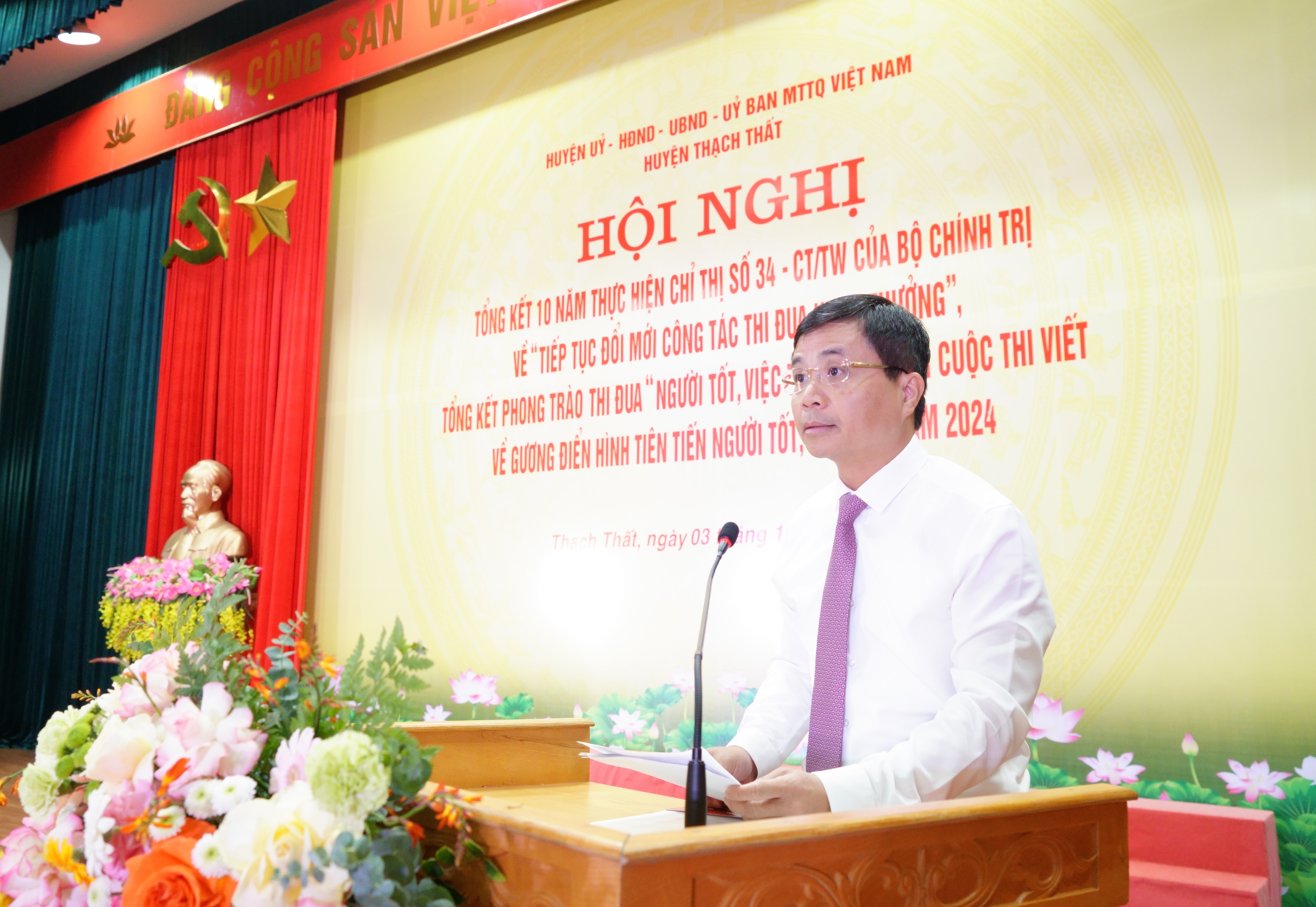 Sáng ngày 3/10, tại hội trường Trung tâm Văn hóa- Thông tin và Thể thao huyện Thạch Thất, UBND huyện tổ chức Hội nghị tổng kết 10 năm thực hiện Chỉ thị 34/2014 của Bộ Chính trị về "Tiếp tục đổi mới công tác thi đua, khen thưởng"; Tổng kết phong trào thi đua “Người tốt, việc tốt” và trao giải Cuộc thi viết về “Gương điển hình tiên tiến, người tốt, việc tốt” năm 2024.
