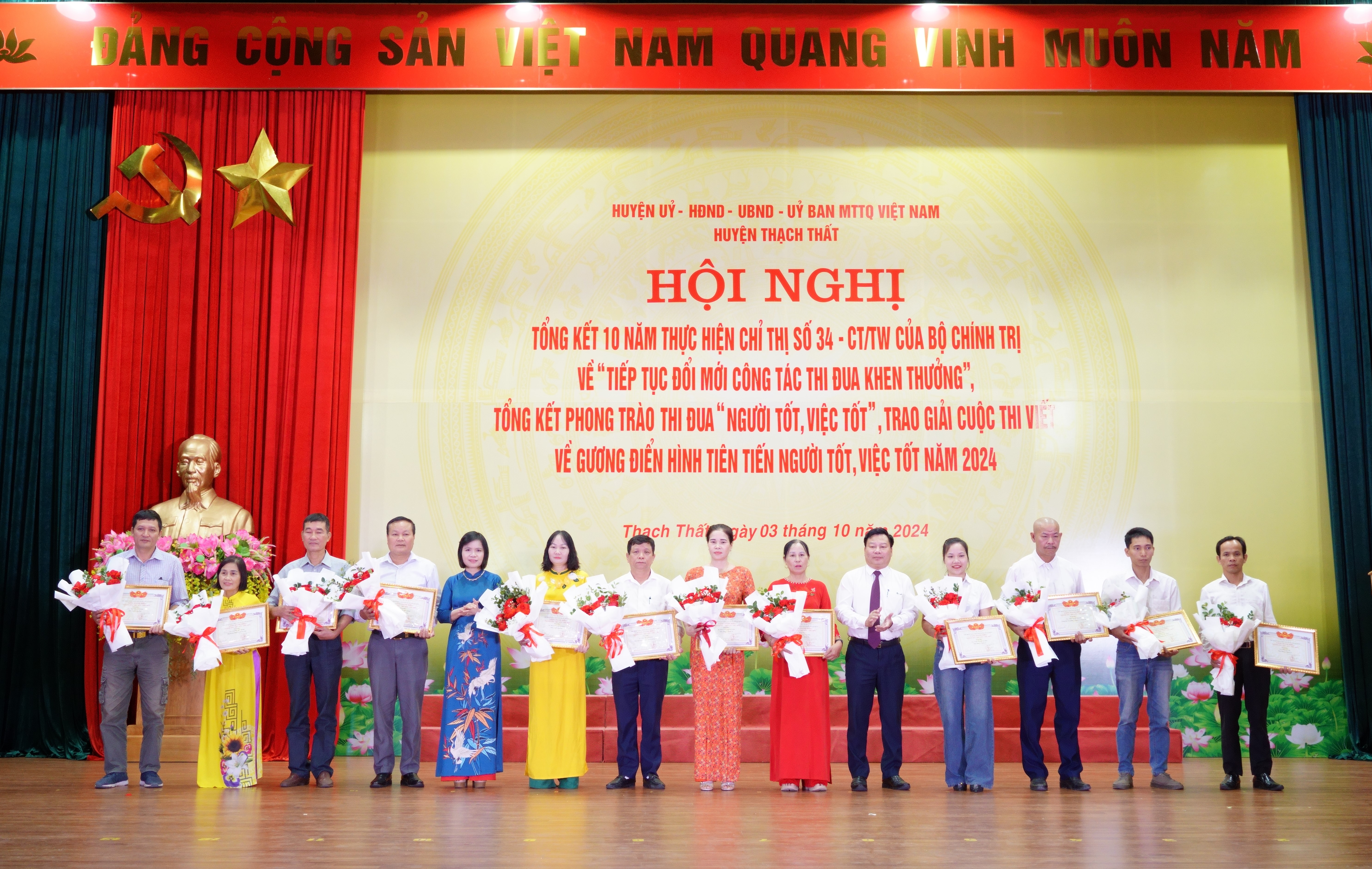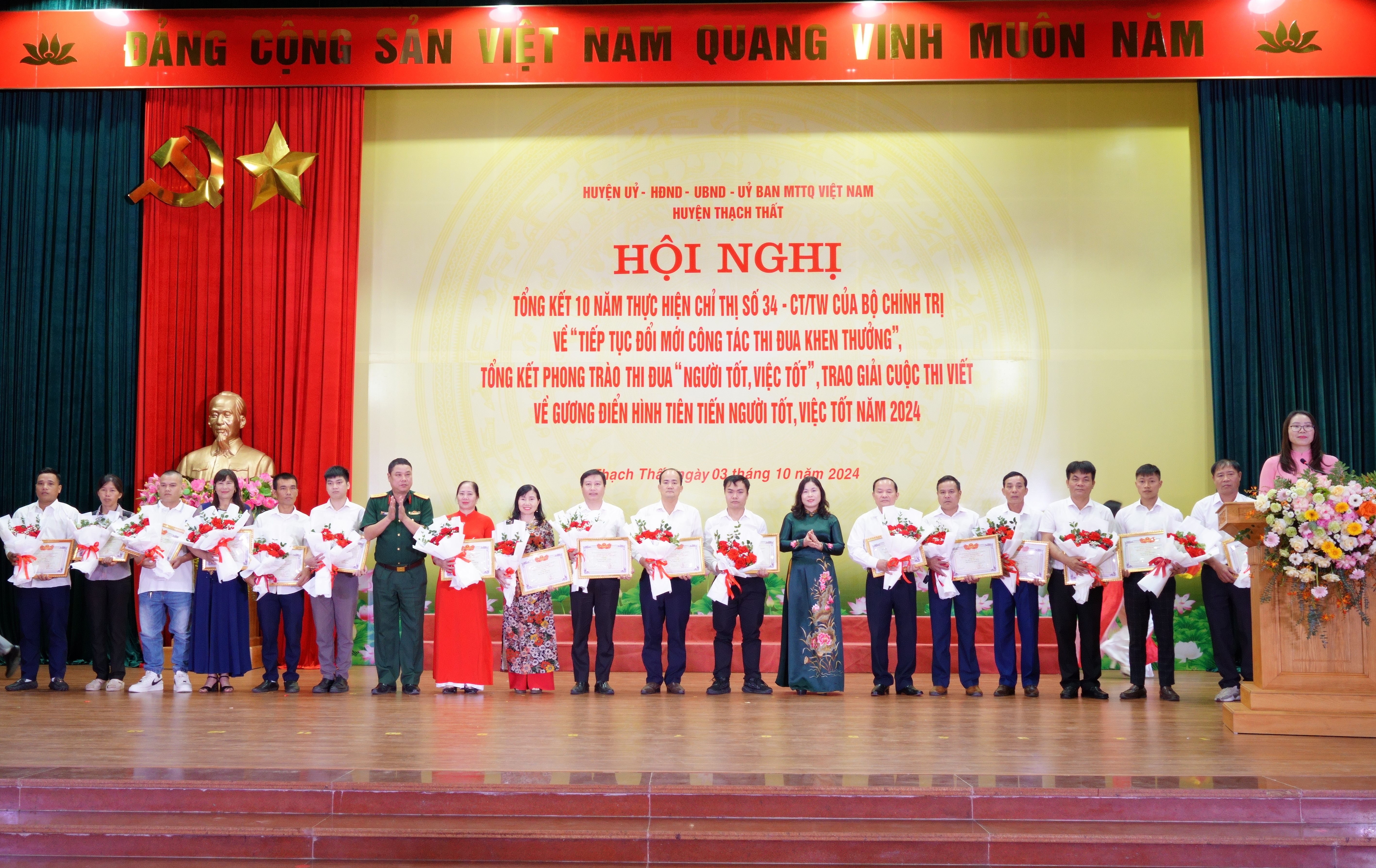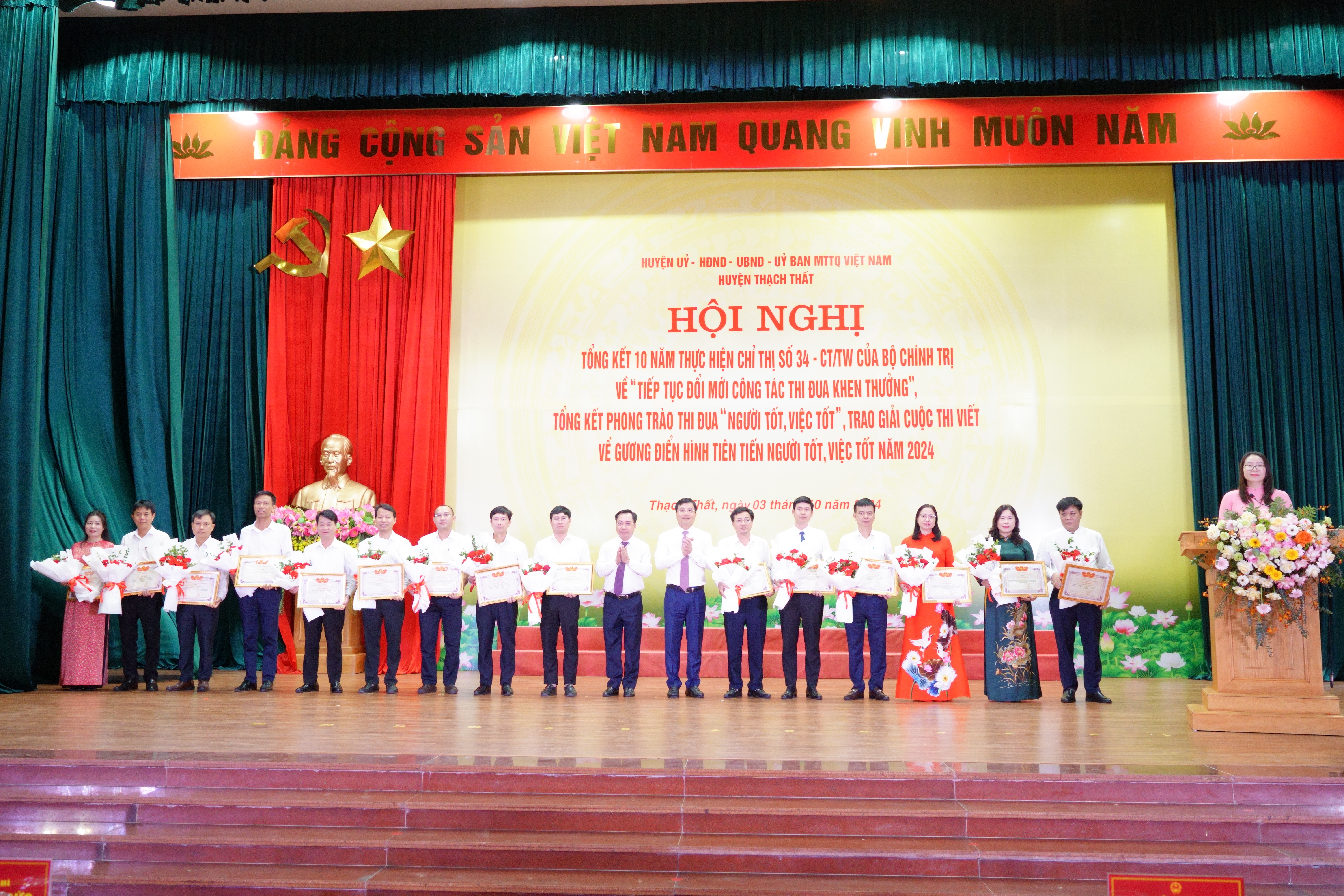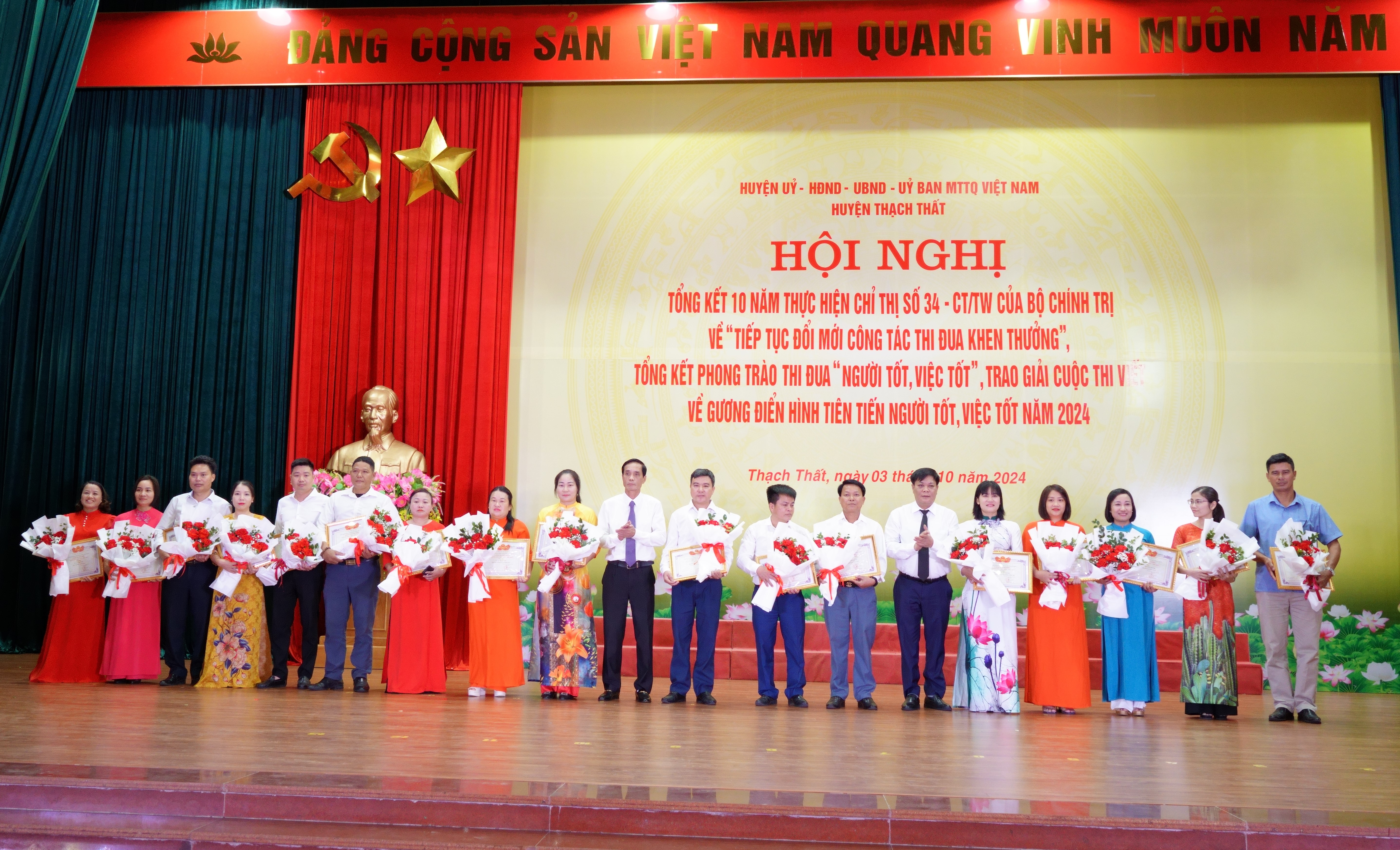 Ghi nhận và biểu dương những kết quả đã đạt được, Chủ tịch UBND huyện khen thưởng 16 tập thể có thành tích xuất sắc trong chỉ đạo, thực hiện Chỉ thị 34/2014 của Bộ Chính trị về "Tiếp tục đổi mới công tác thi đua, khen thưởng"; Chủ tịch UBND thành phố trao tặng Danh hiệu “Gương người tốt, việc tốt” năm 2024 cho 31 cá nhân; Chủ tịch UBND huyện Thạch Thất trao tặng Danh hiệu “Gương người tốt, việc tốt" năm 2024 cho 153 cá nhân.