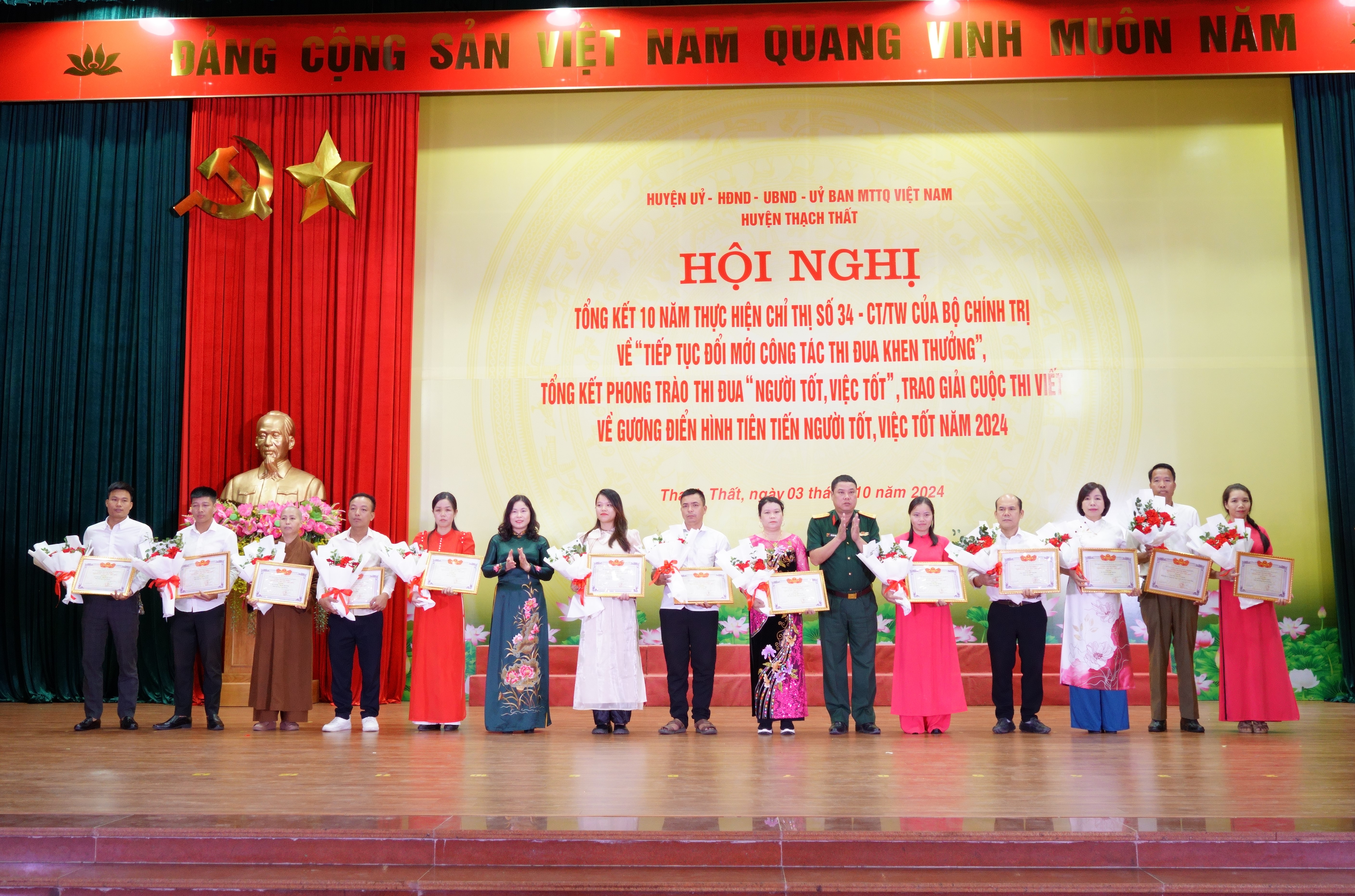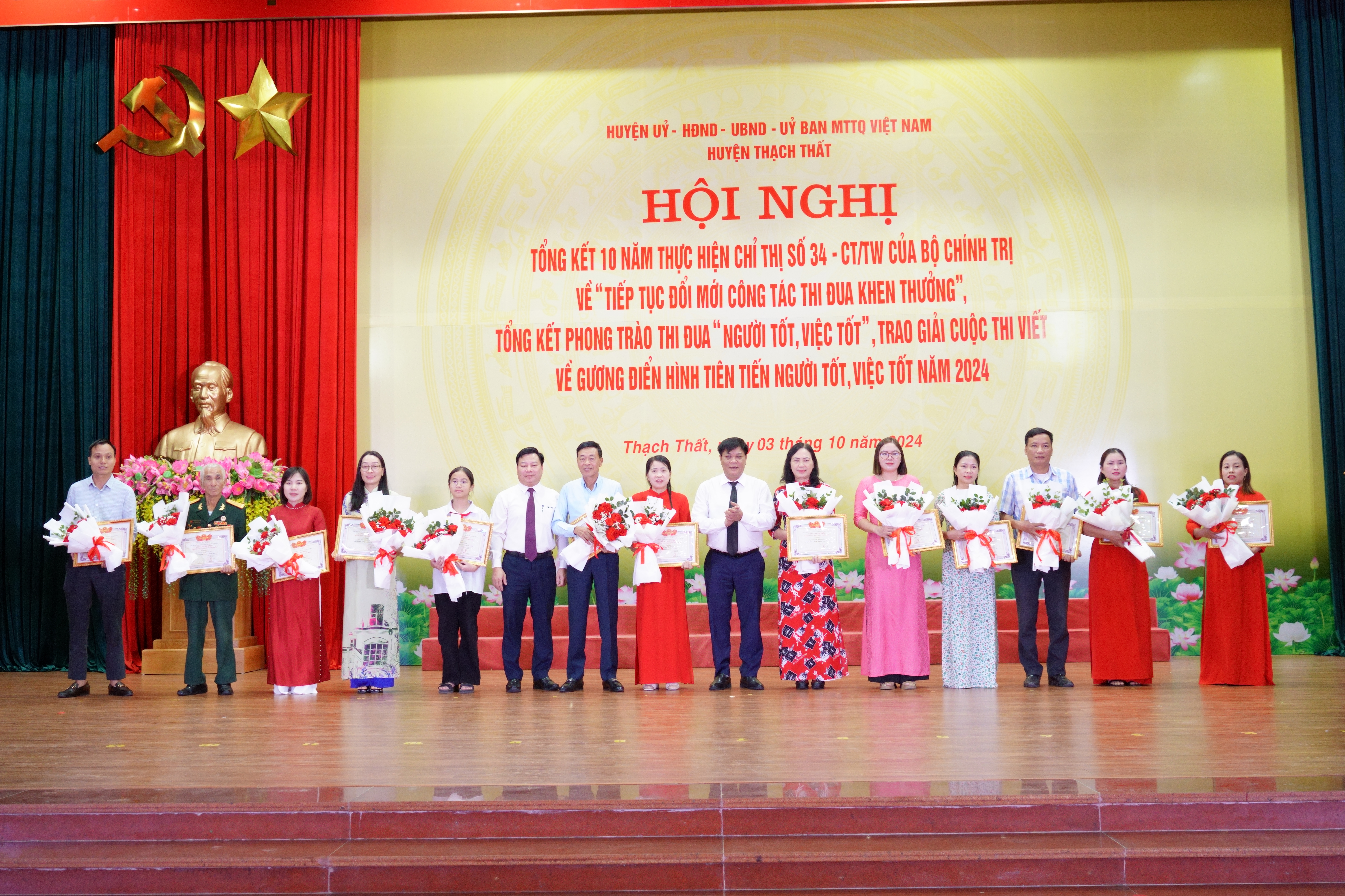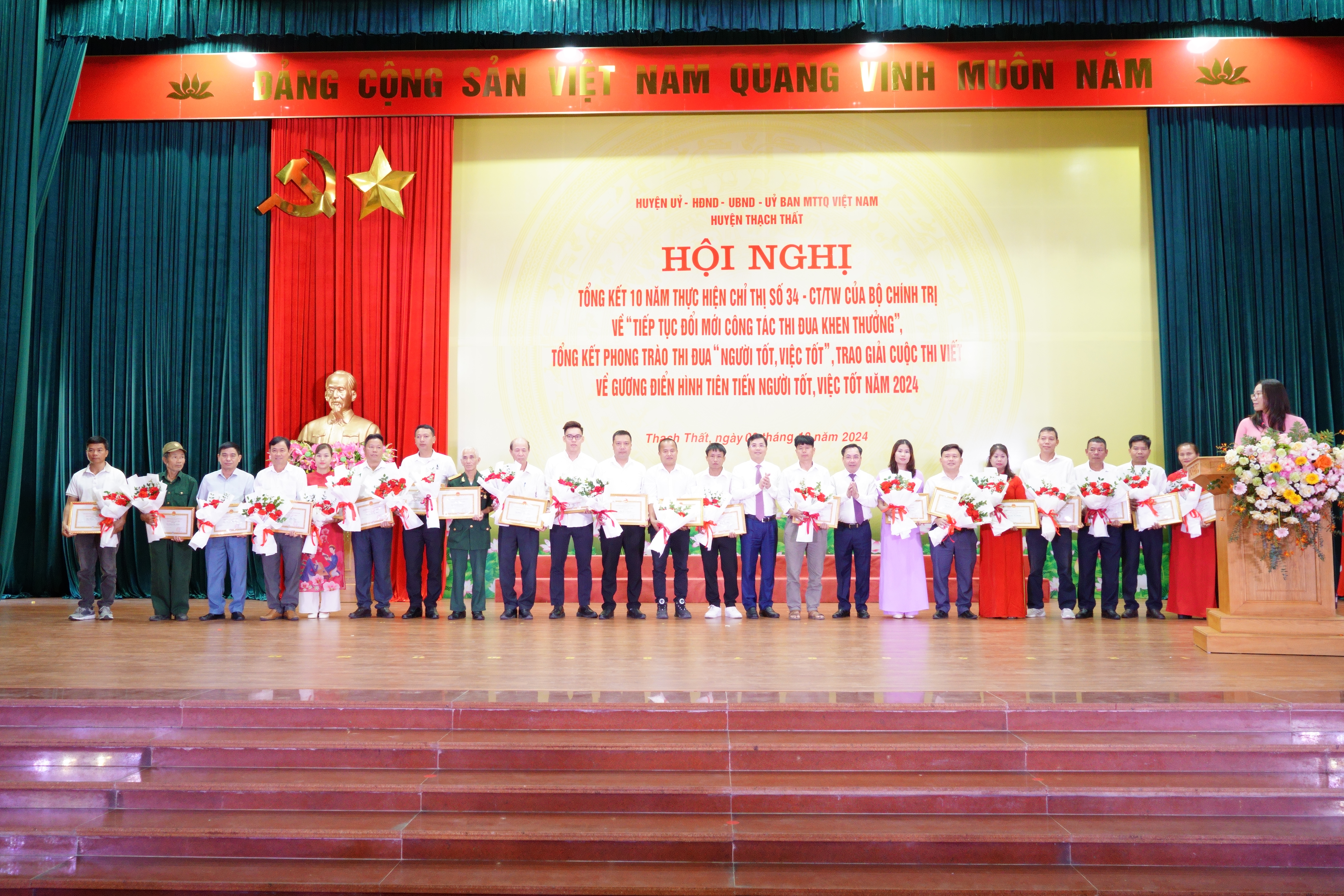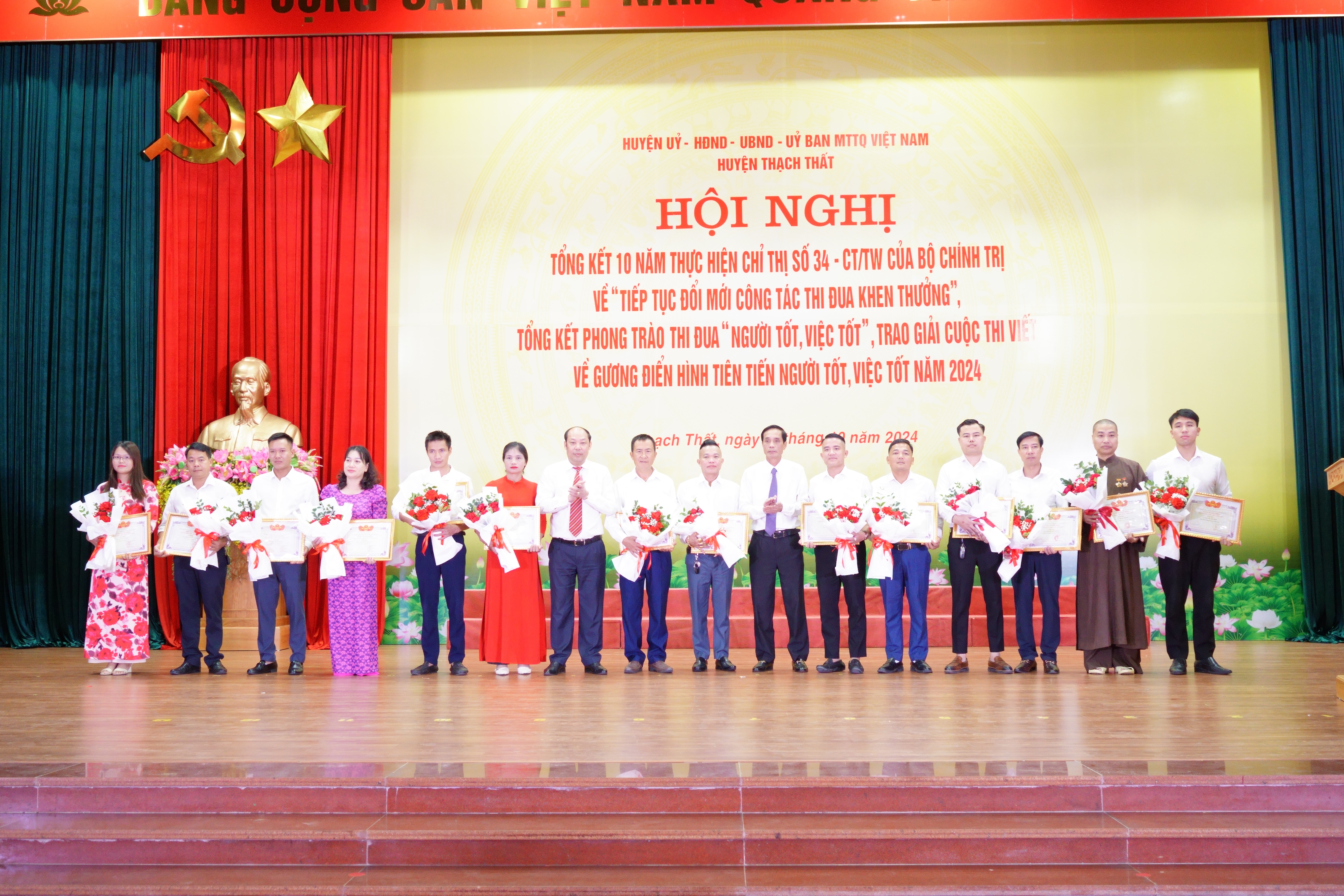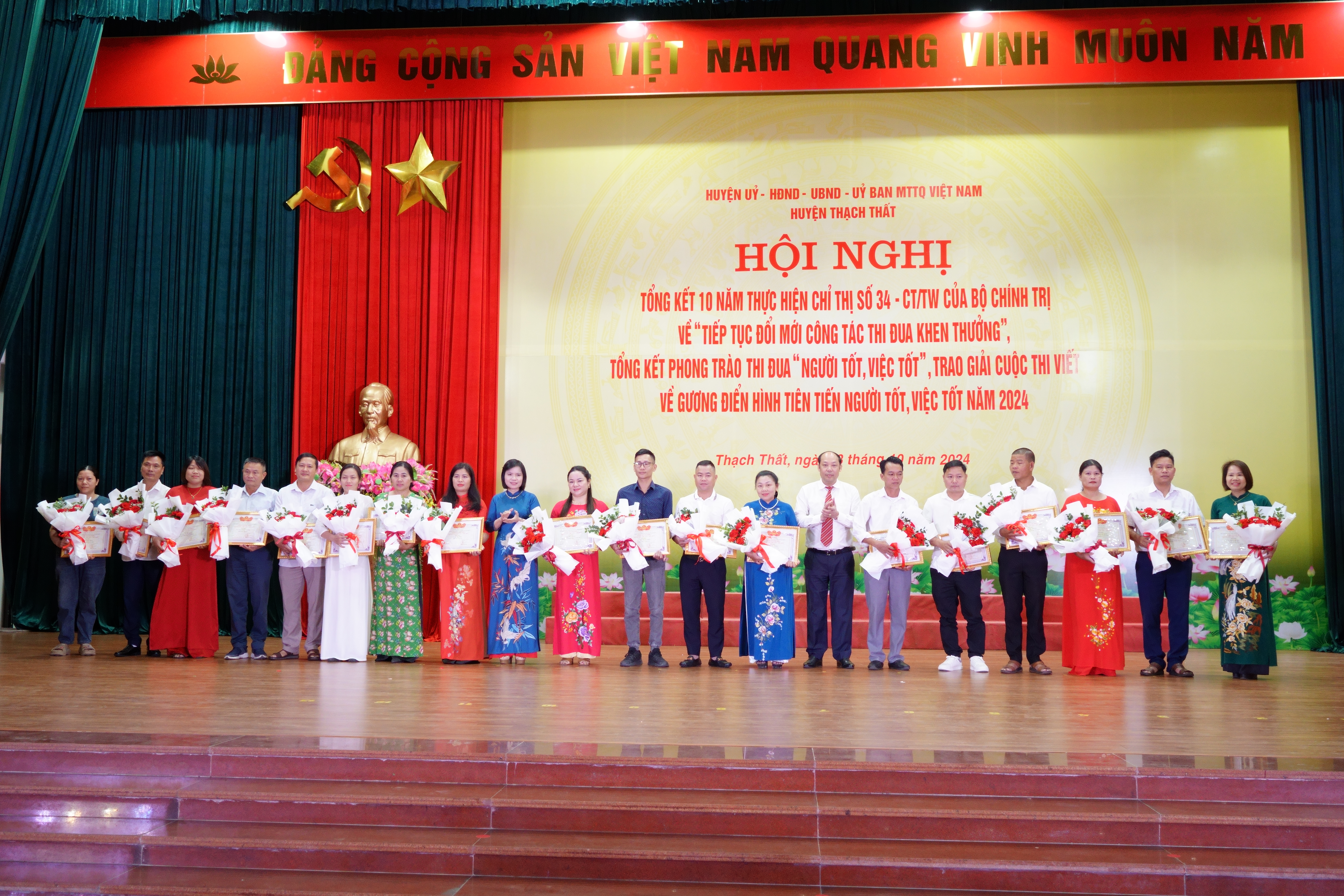 Ghi nhận và biểu dương những kết quả đã đạt được, Chủ tịch UBND huyện khen thưởng 16 tập thể có thành tích xuất sắc trong chỉ đạo, thực hiện Chỉ thị 34/2014 của Bộ Chính trị về "Tiếp tục đổi mới công tác thi đua, khen thưởng"; Chủ tịch UBND thành phố trao tặng Danh hiệu “Gương người tốt, việc tốt” năm 2024 cho 31 cá nhân; Chủ tịch UBND huyện Thạch Thất trao tặng Danh hiệu “Gương người tốt, việc tốt" năm 2024 cho 153 cá nhân.