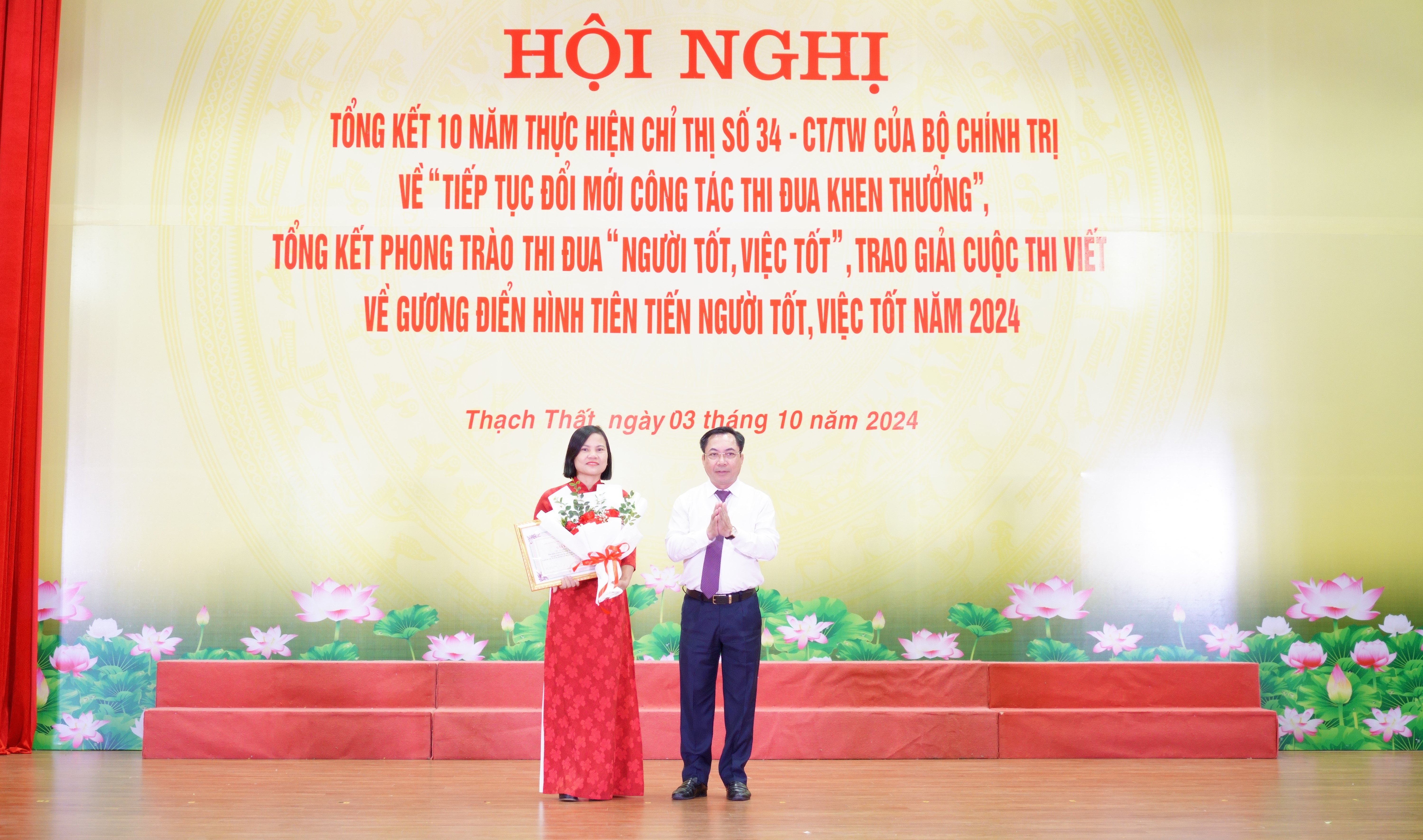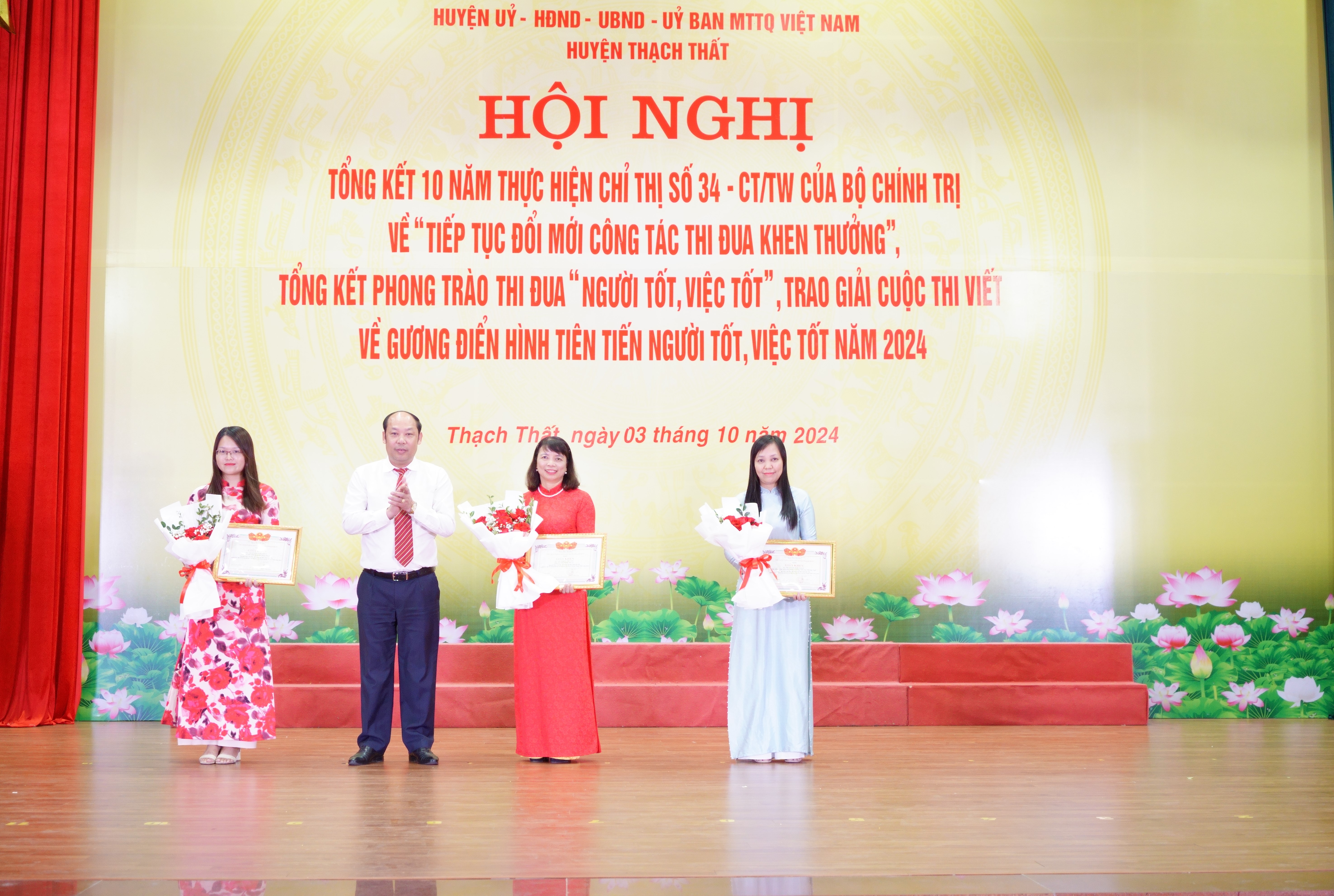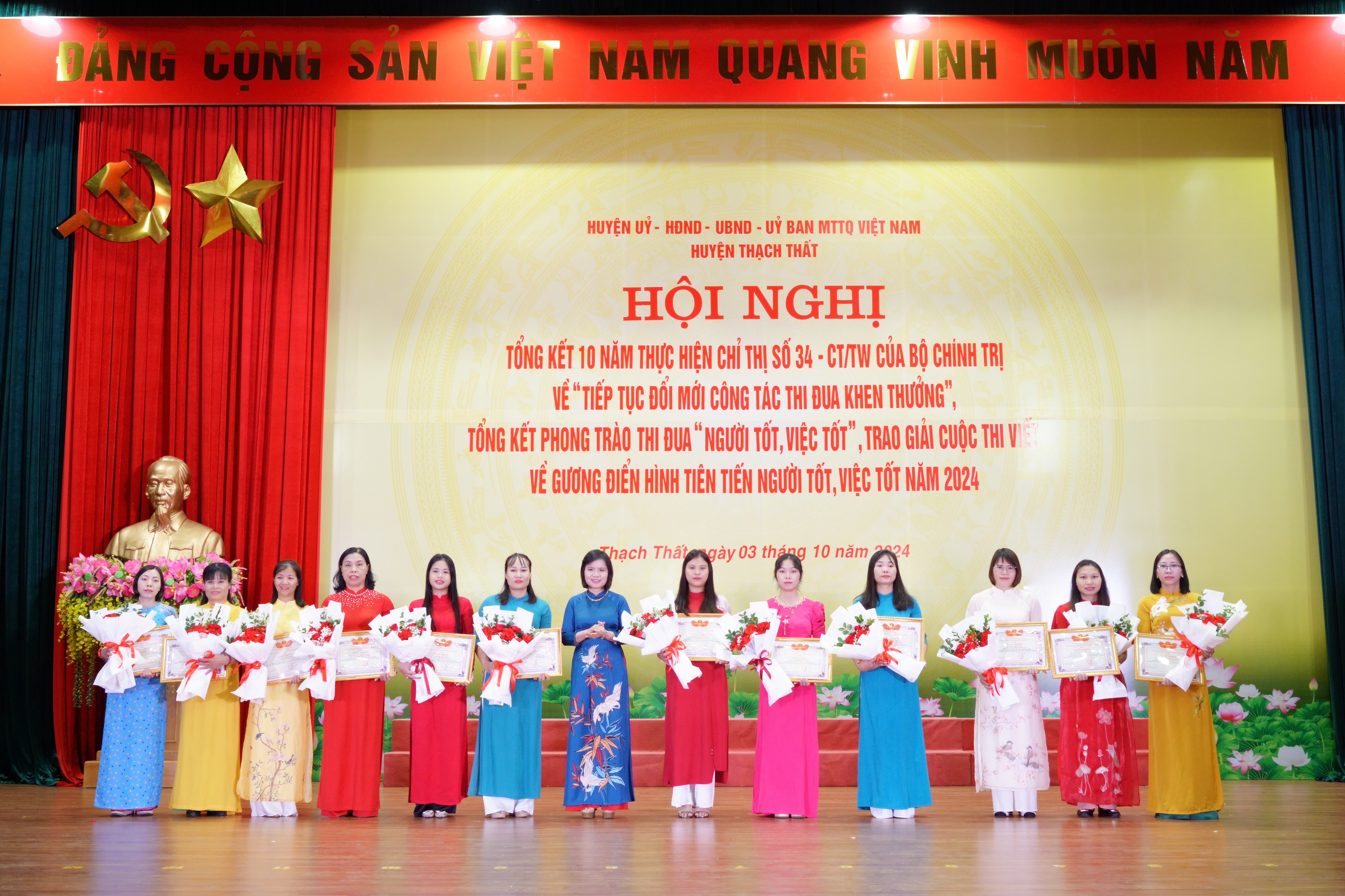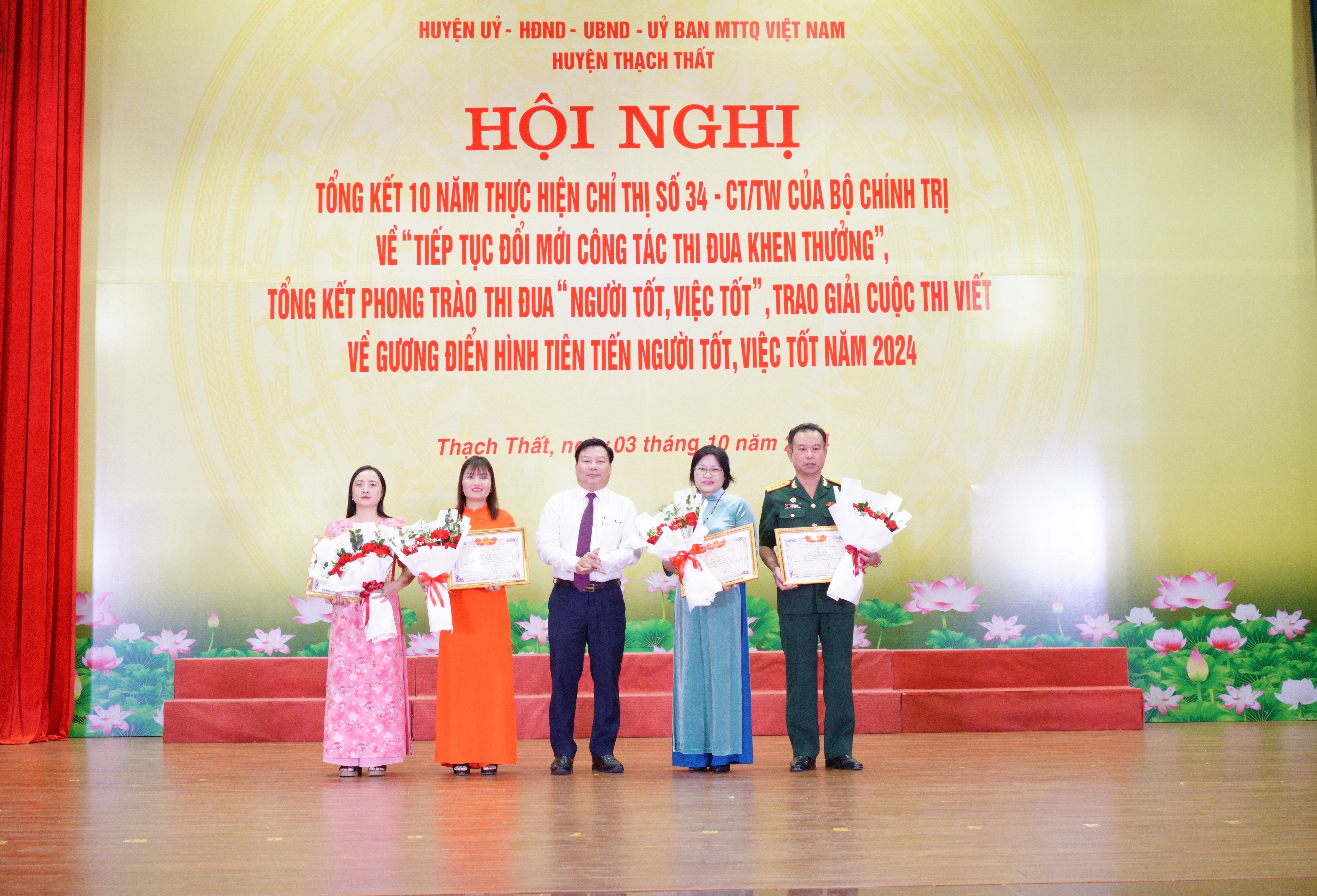 Ghi nhận và biểu dương những kết quả đã đạt được, Chủ tịch UBND huyện khen thưởng 16 tập thể có thành tích xuất sắc trong chỉ đạo, thực hiện Chỉ thị 34/2014 của Bộ Chính trị về "Tiếp tục đổi mới công tác thi đua, khen thưởng"; Chủ tịch UBND thành phố trao tặng Danh hiệu “Gương người tốt, việc tốt” năm 2024 cho 31 cá nhân; Chủ tịch UBND huyện Thạch Thất trao tặng Danh hiệu “Gương người tốt, việc tốt" năm 2024 cho 153 cá nhân.