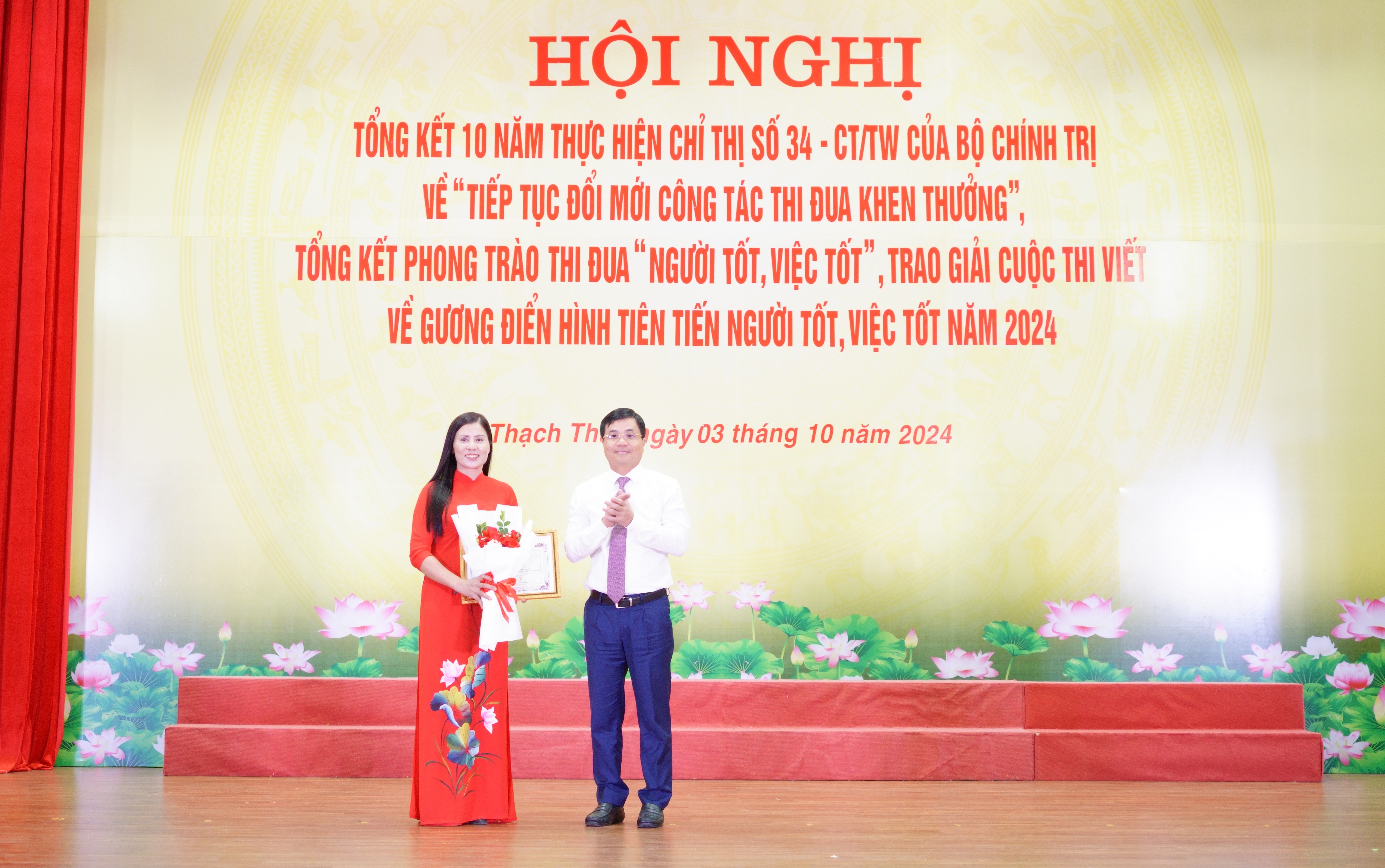 Đồng chí Lê Minh Đức- TUV- Bí thư Huyện ủy trao giải Đặc biệt Cuộc thi viết về “Gương điển hình tiên tiến, người tốt việc tốt” năm 2024 cho tác giả Đỗ Bích Hòa- Giáo viên Trường Tiểu học Thạch Xá
