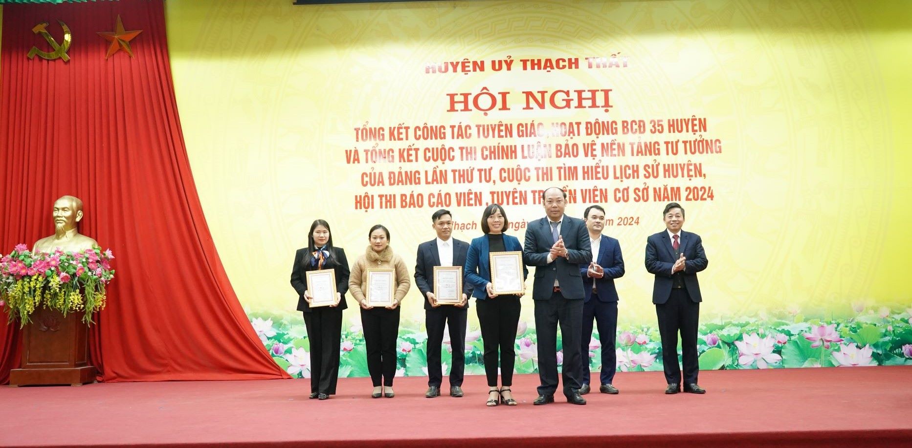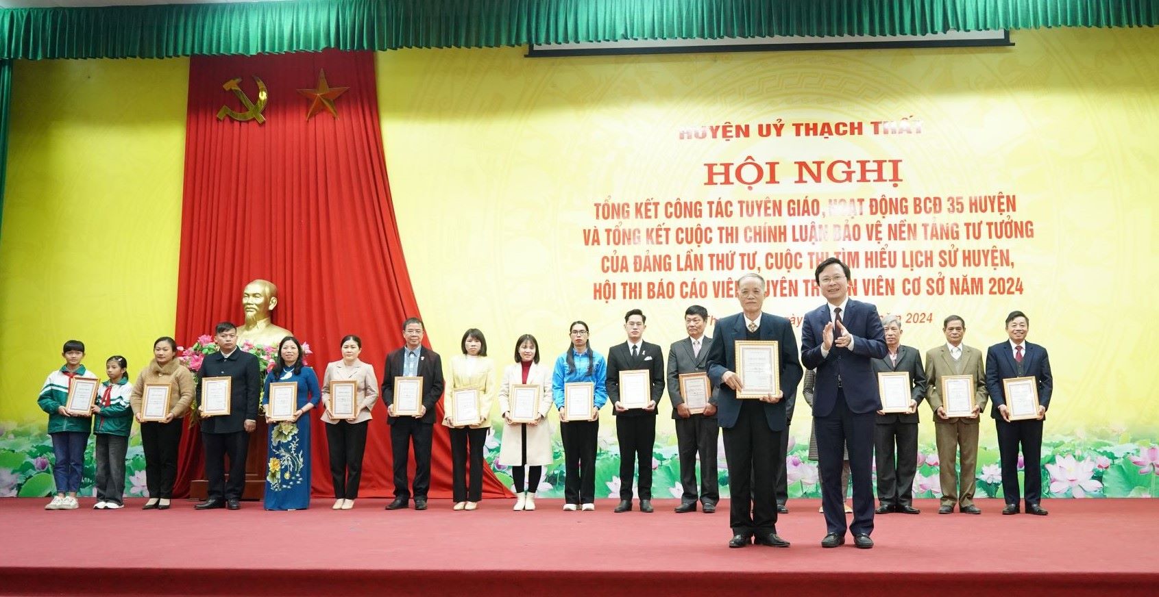 Tại hội nghị, Huyện ủy đã khen thưởng cho các tập thể, cá nhân đạt giải Nhất, Nhì, Ba, Khuyến khích; các tập thể có thành tích xuất sắc trong tổ chức các cuộc thi năm 2024. Giải nhất cuộc thi Chính luận bảo vệ nền tảng tư tưởng của Đảng lần thứ 4 được trao cho nhóm tác giả Trung tâm Văn hóa, Thông tin & Thể thao huyện; Giải nhất Cuộc thi tìm hiểu Lịch sử huyện Thạch Thất trao cho đảng viên Phí Bá Quát, chi bộ 2, Đảng bộ xã Chàng Sơn và em Nguyễn Thái Chí, học sinh lớp 12A6, Trường THPT Minh Hà; Giải nhất Hội thi Báo cáo viên, tuyên truyền viên cơ sở năm 2024 được trao cho đồng chí Nguyễn Thanh Hùng, Bí thư chi bộ 5, Đảng bộ xã Thạch Hòa./.