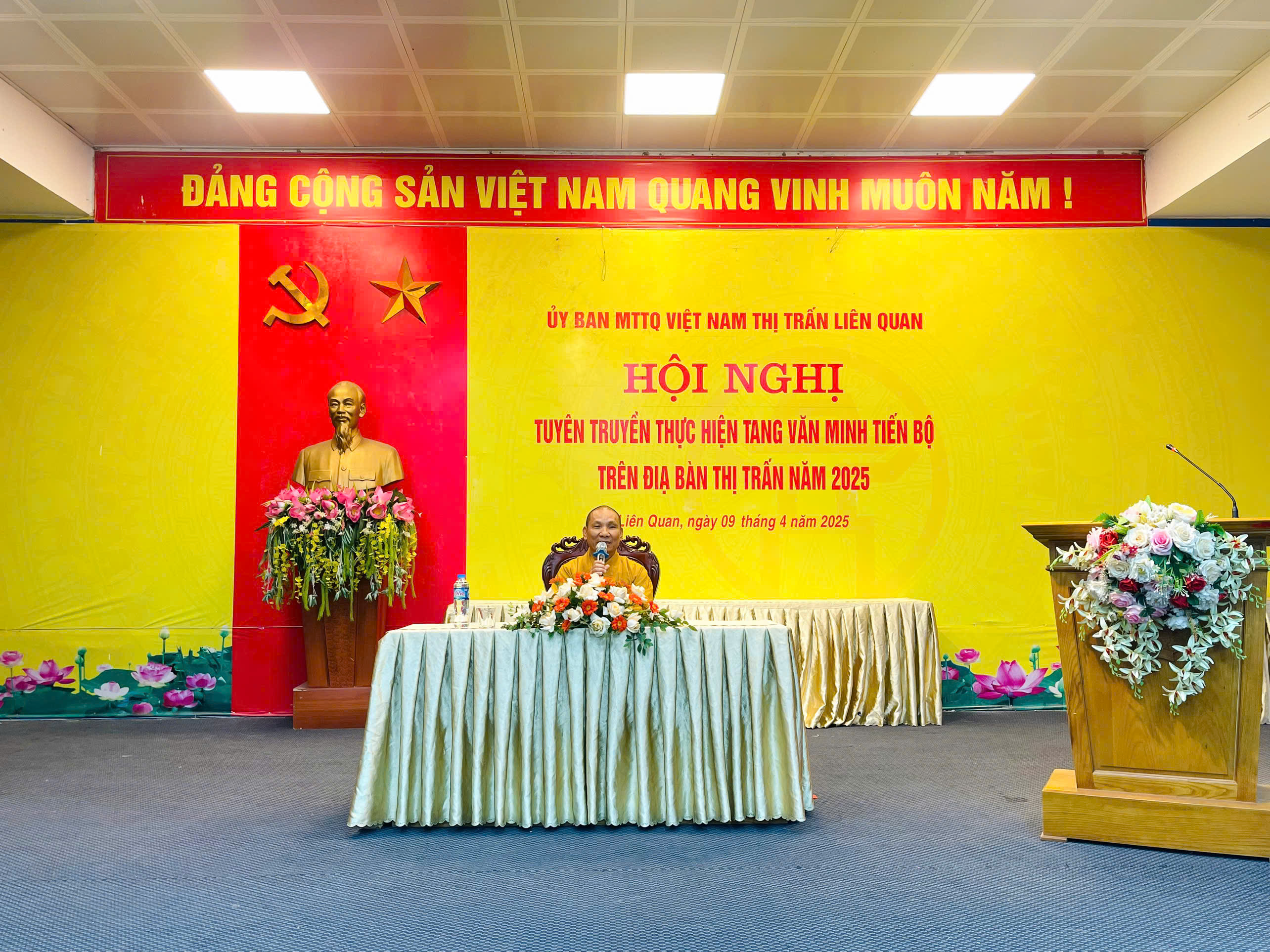 10/04/2025Sáng ngày 9/4, tại hội trường UBND Thị trấn Liên Quan, UBMTTQVN thị trấn phối hợp với Hội Người cao tuổi, Hội Cựu chiến binh tổ chức hội nghị tuyên truyền thực hiện tang văn minh tiến bộ năm 2025. Lãnh đạo Đảng ủy, Thường trực HĐND, UBND, Ủy ban MTTQVN; Trưởng các hội đoàn thể chính trị- xã hội Thị trấn; các đồng chí Bí thư chi bộ, Tổ trưởng tổ dân phố; trưởng các dòng họ và cán bộ, hội viên Hội Người cao tuổi, Hội Cựu chiến binh trên địa bàn Thị trấn dự hội nghị.
