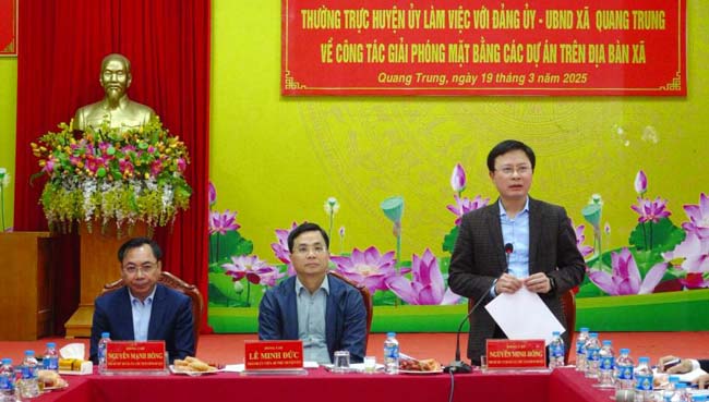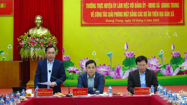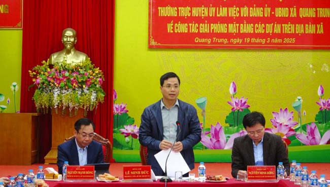 Phát biểu kết luận buổi làm việc, đồng chí Bí thư Huyện ủy ghi nhận, đánh giá cao Đảng ủy, UBND, cả hệ thống chính trị 2 xã Quang Trung, Thạch Xá sau sắp xếp, sáp nhập đã đoàn kết, tập trung lãnh đạo, chỉ đạo quyết liệt, thực hiện đồng bộ, có hiệu quả các nhiệm vụ chính trị cũng như công tác giải phóng mặt bằng thực hiện các dự án trên địa bàn.