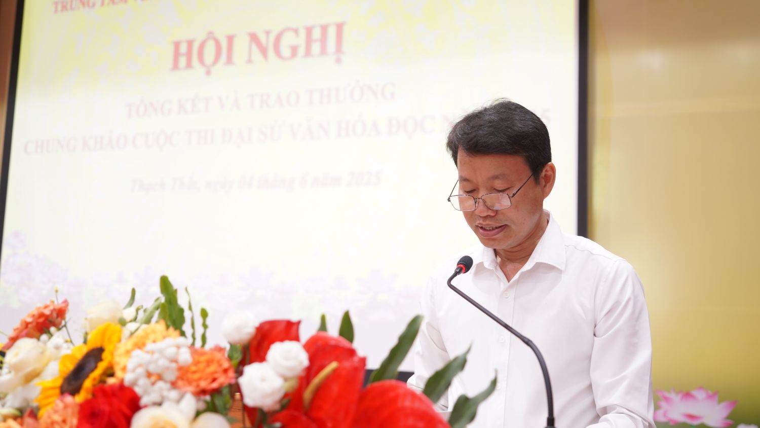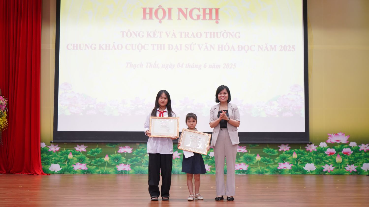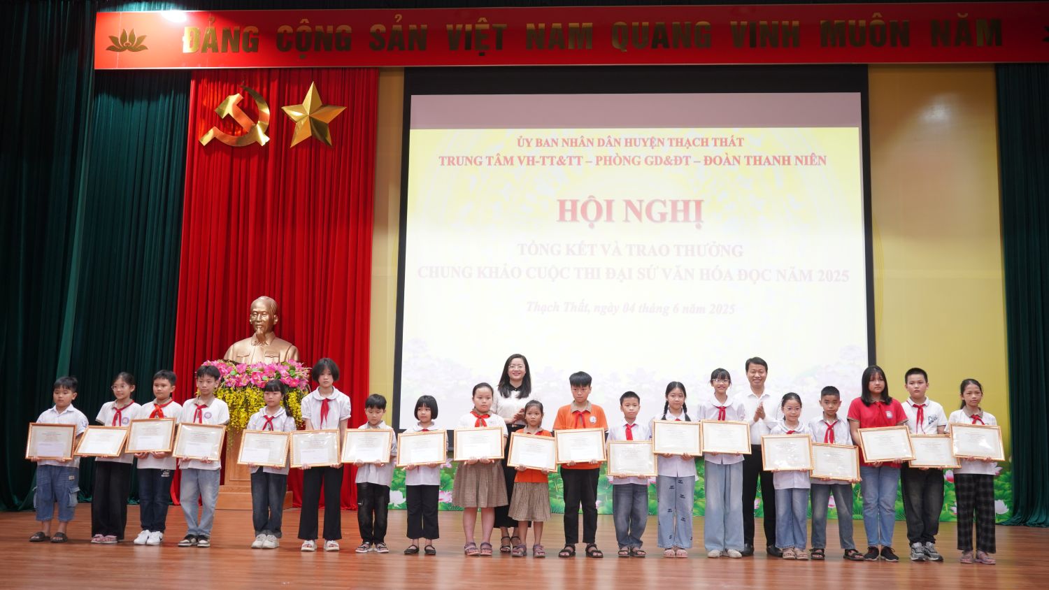 05/06/2025Sáng ngày 4/6, Trung tâm VHTT&TT huyện phối hợp với Phòng Giáo dục – Đào tạo huyện, Huyện đoàn Thạch Thất tổ chức hội nghị tổng kết và trao thưởng chung khảo cuộc thi đại sứ văn hoá đọc huyện Thạch Thất năm 2025. Đồng chí Nguyễn Thị Bích Ngọc – UVBTV Huyện uỷ, Phó Chủ tịch UBND huyện; ; đ/c Nguyễn Đình Tùng – HUV, Phó Trưởng Ban Tuyên giáo và Dân vận Huyện uỷ; đ/c Phạm Quang Thái – HUV – Trưởng Phòng Văn hoá, Khoa học và Thông tin huyện; đ/c Đỗ Toàn Thắng – HUV, Trưởng Phòng Giáo dục và Đào tạo huyện; đ/c Đặng Văn Võ – HUV, Giám đốc TTVHTT&TT huyện; đ/c Phùng Thị Huyền – Bí thư Huyện đoàn; đại diện Phòng nghiệp vụ văn hoá cơ sở, Trung tâm Văn hoá và Thư viện Hà Nội dự chương trình.