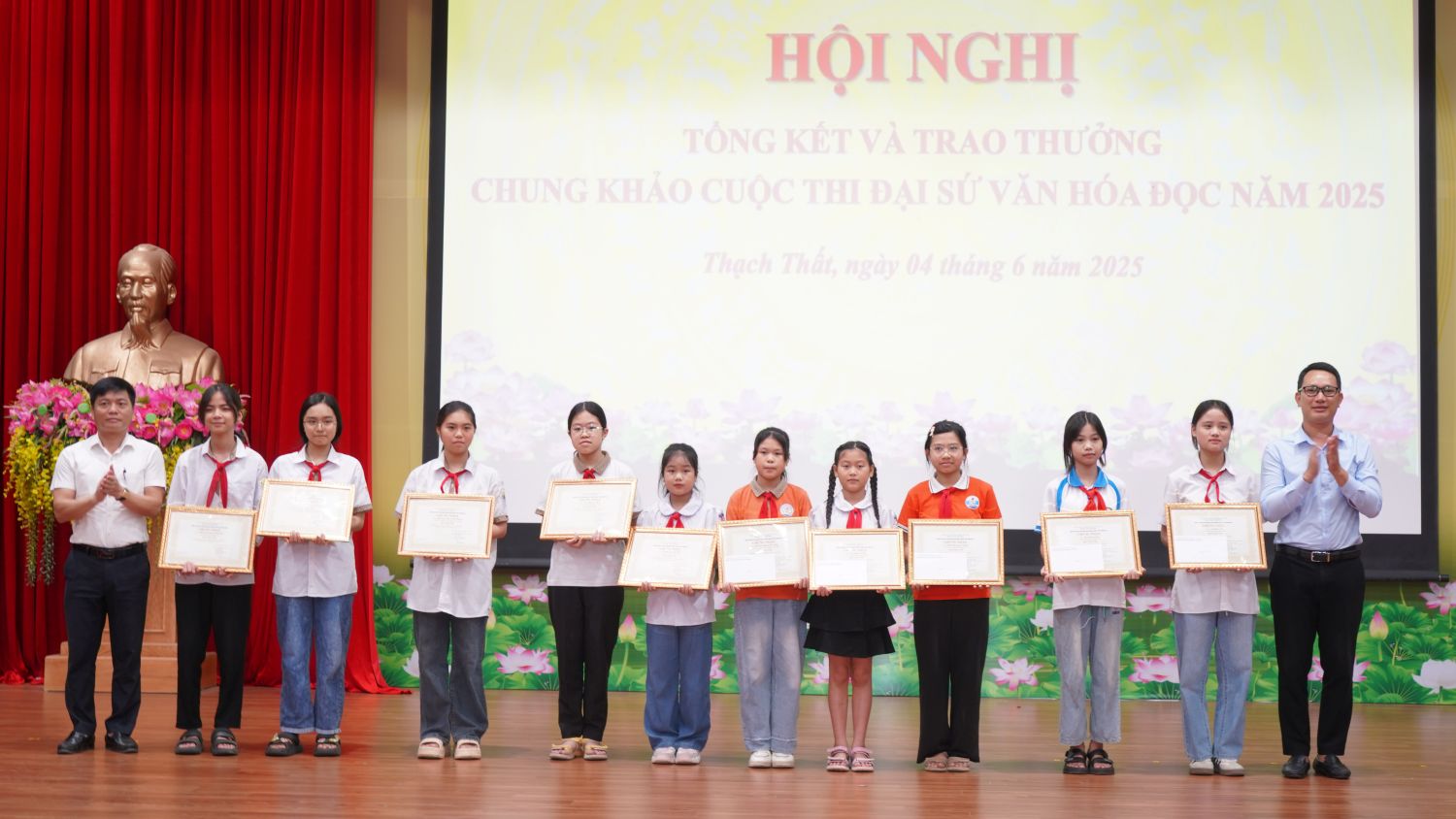 Thông qua cuộc thi giúp các em hiểu biết sâu sắc về Thạch Thất, Thủ đô Hà Nội. Từ đó giáo dục, hun đúc cho các em tình yêu quê hương đất nước, nâng cao ý thức tu dưỡng, rèn luyện đạo đức và phấn đấu học tập để sau này góp phần xây dựng quê hương, thủ đô ngày càng phồn vinh và hiện đại, xứng tầm là trái tim của cả nước. Chung khảo cuộc thi “Đại sứ văn hóa đọc” huyện Thạch Thất năm 2025 gồm có 25 đơn vị tham gia dự thi đến từ các trường Tiểu học, THCS trên địa bàn huyện. Ban tổ chức, Ban giám khảo đã khách quan, công tâm chọn các bài viết, các video xuất sắc để trao giải trong Hội nghị tổng kết. Các bài viết, video đạt giải cao sẽ được Ban tổ chức lựa chọn gửi tham dự Cuộc thi “Đại sứ văn hóa đọc” thành phố Hà Nội được tổ chức vào cuối tháng 6, đầu tháng 7/2025. Tại hội nghị, Ban tổ chức đã khen thưởng, tặng giấy chứng nhận cho 67 em học sinh các trường Tiểu học, THCS đạt giải trong Cuộc thi Đại sứ văn hoá đọc huyện Thạch Thất năm 2025, trong đó, có 2 giải Nhất, 10 giải Nhì, 20 giải Ba, 35 giải Khuyến khích. Em Kiều Phương Khánh Huyền – lớp 1C trường Tiểu học Thạch Xá và em Nguyễn Bảo Trâm – lớp 7A9, trường THCS Hữu Bằng đã xuất sắc giành giải Nhất của cuộc thi “Đại sứ văn hoá đọc” huyện Thạch Thất năm 2025.