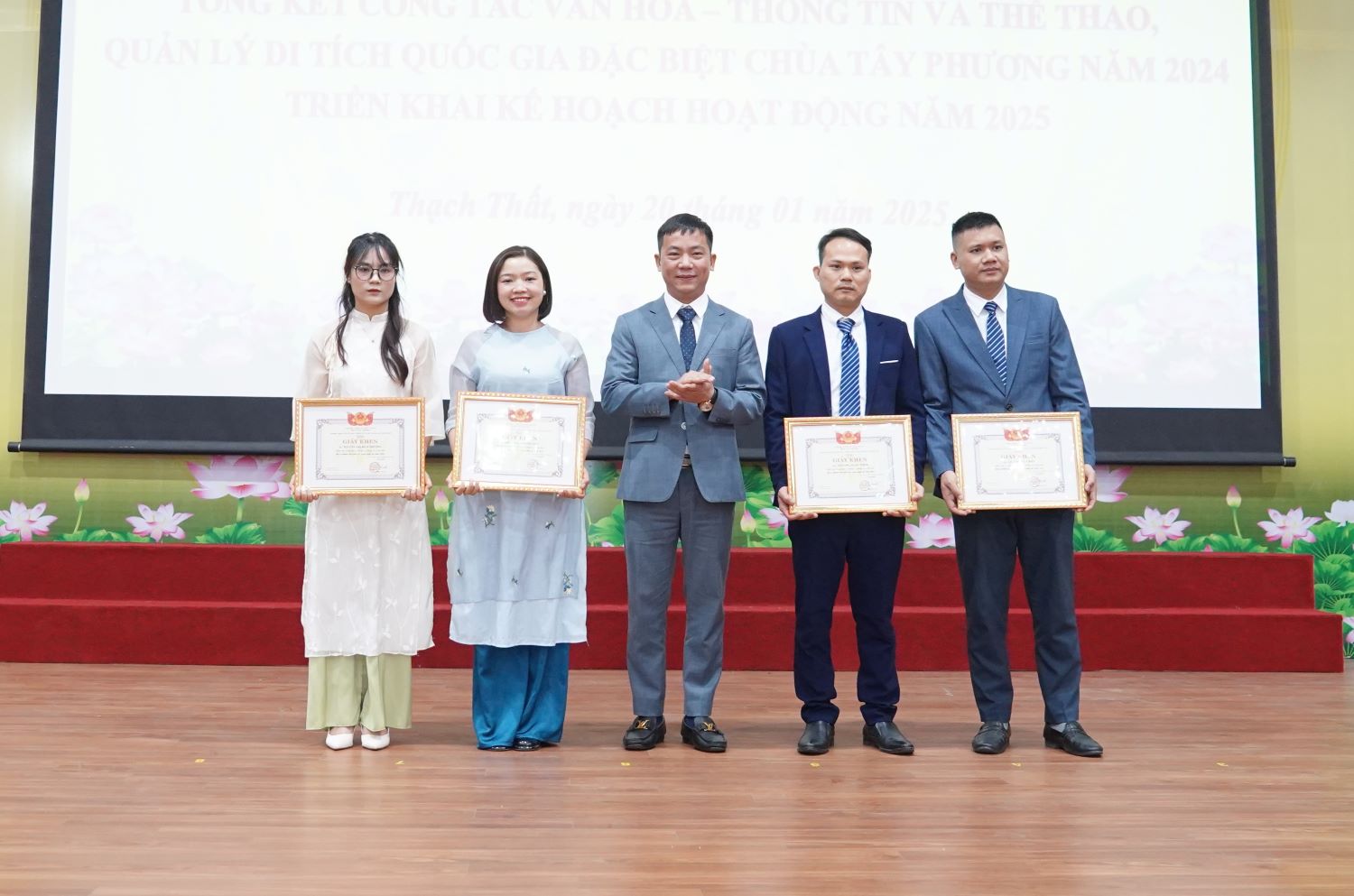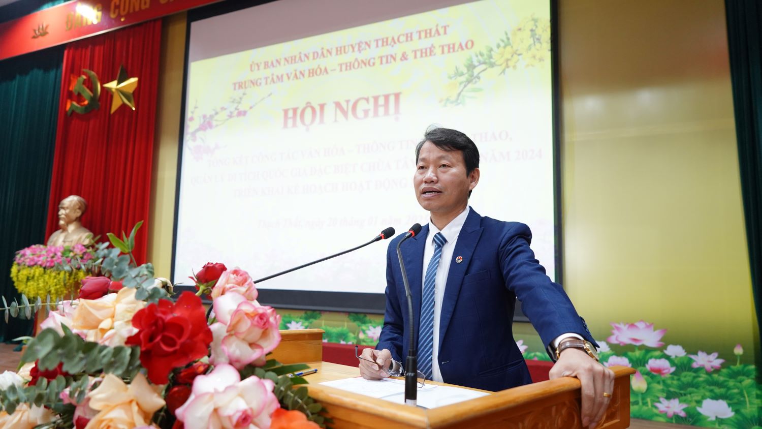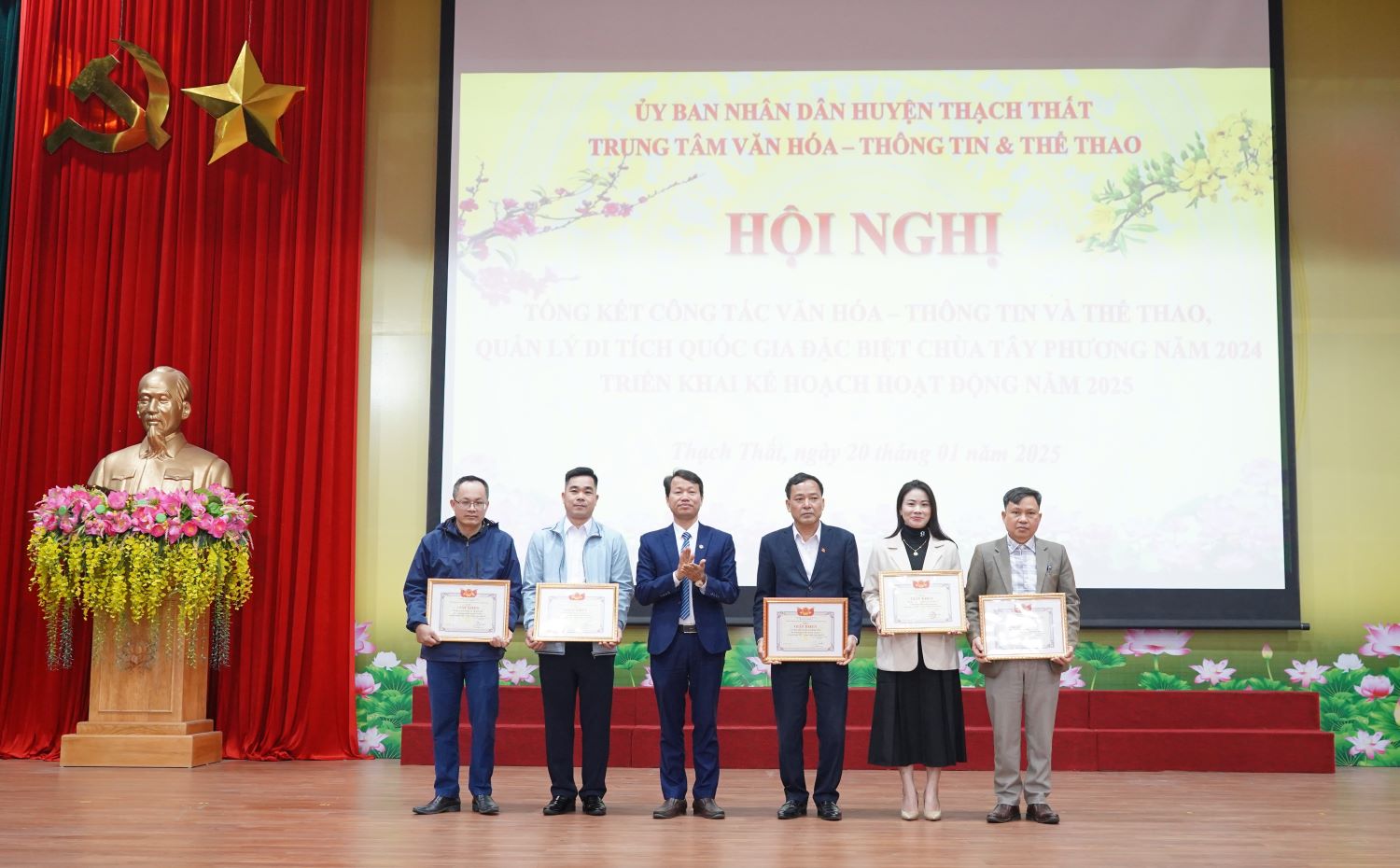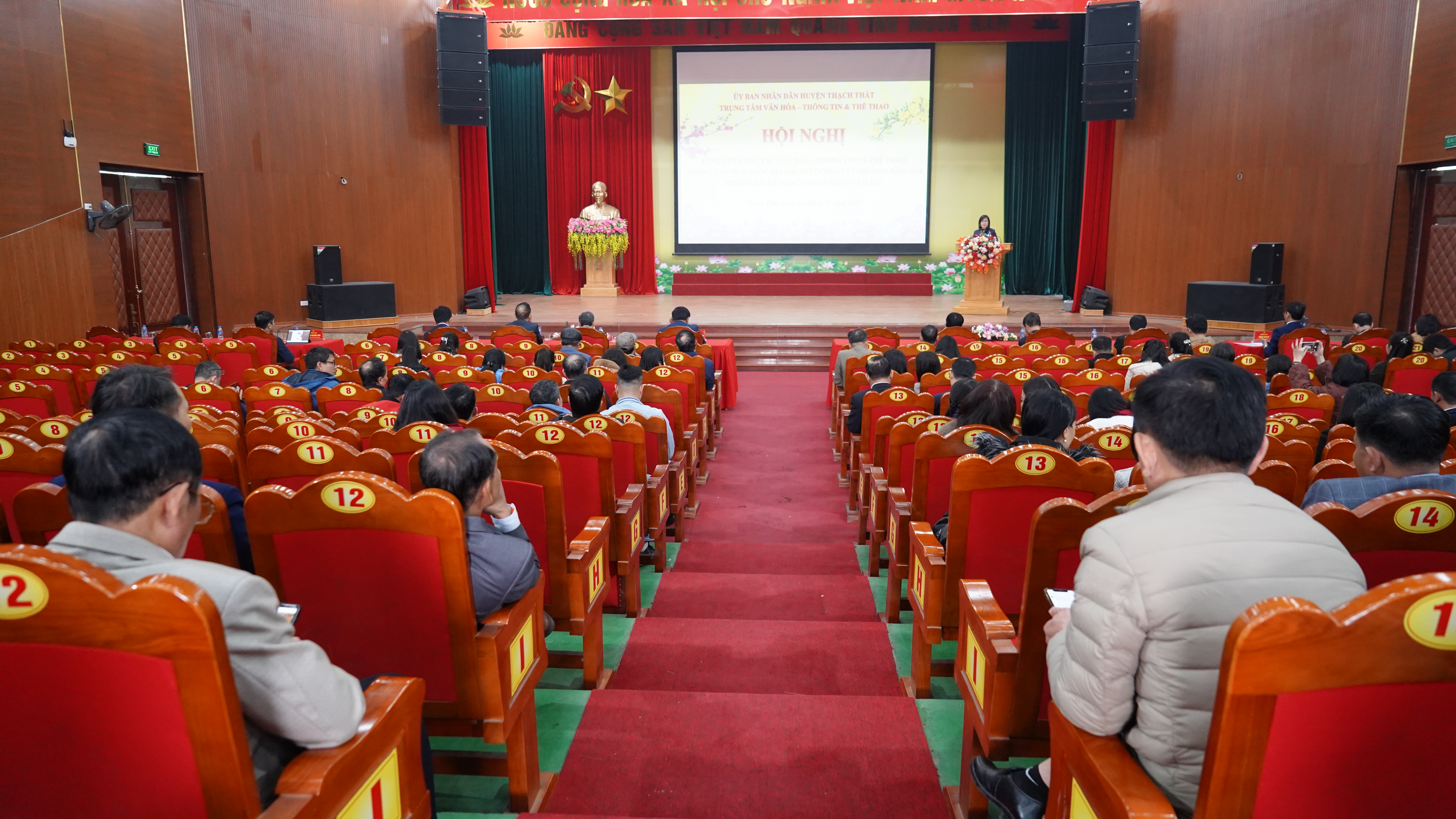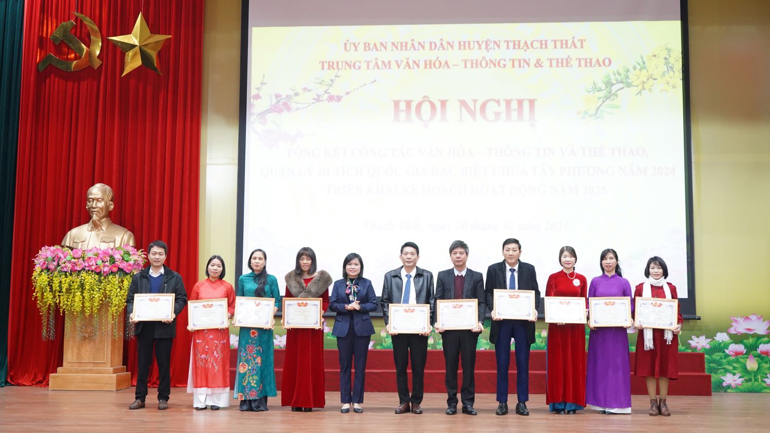 Sáng ngày 20/1, Trung tâm Văn hoá, Thông tin và Thể thao (Trung tâm VHTT&TT) huyện Thạch Thất tổ chức hội nghị tổng kết công tác văn hoá, thông tin và thể thao, quản lý Di tích quốc gia đặc biệt Chùa Tây Phương năm 2024, triển khai kế hoạch hoạt động năm 2025. Đ/c Nguyễn Đăng Quân – UVBTV, Trưởng Ban Tuyên giáo Huyện uỷ; đ/c Nguyễn Thị Bích Ngọc – UVBTV Huyện uỷ, Phó Chủ tịch UBND huyện, đ/c Phạm Quang Thái – HUV – Trưởng Phòng Văn hoá Thông tin huyện; các đồng chí nguyên lãnh đạo Trung tâm qua các thời kỳ; lãnh đạo UBND, cán bộ công chức văn hoá, cán bộ đài phát thanh các xã, thị trấn cùng tập thể trung tâm dự hội nghị.