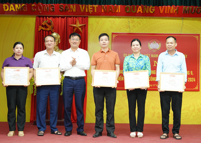 Đ/c Phí Văn Hưng- Phó Chủ tịch UB MTTQ huyện trao giải Khuyến khích cho UB MTTQ các xã: Chàng Sơn, Lại Thượng, Bình Phú, Yên Bình, Đại Đồng