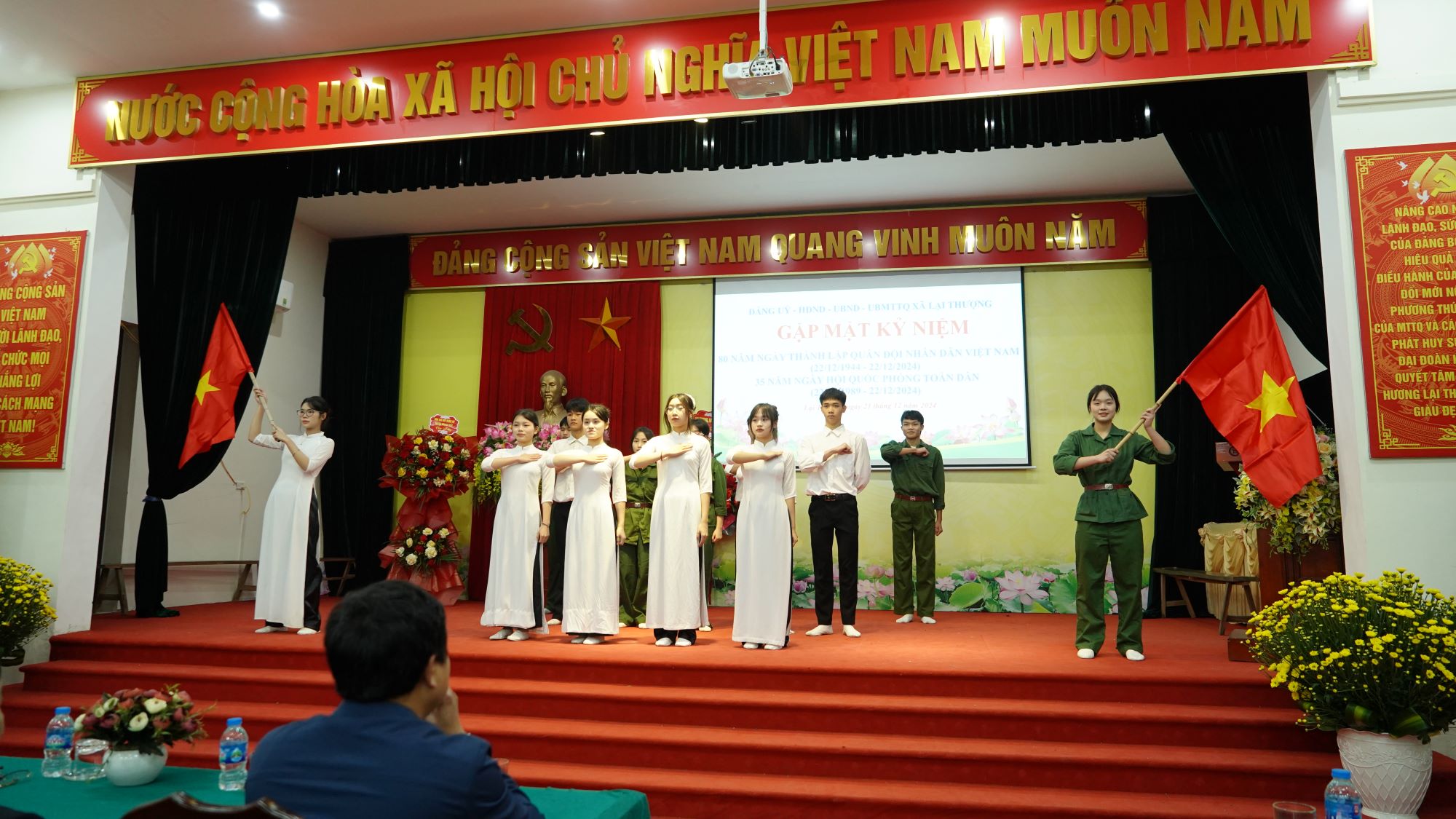 22/12/2024Sáng ngày 21/12/2024, xã Lại Thượng tổ chức hội nghị gặp mặt kỷ niệm 80 năm ngày thành lập quân đội nhân dân Việt Nam (22/12/1944 – 22/12/2024); 35 năm ngày hội quốc phòng toàn dân (22/12/1989 – 22/12/2024), với gần 200 đại biểu tham dự. Đồng chí Đỗ Thị Bích- UVBTV Huyện ủy, Trưởng Ban Dân vận Huyện ủy, đồng chí Đỗ Toàn Thắng, HUV, Trưởng phòng Giáo dục&Đào tạo huyện tới dự, tặng hoa chúc mừng.